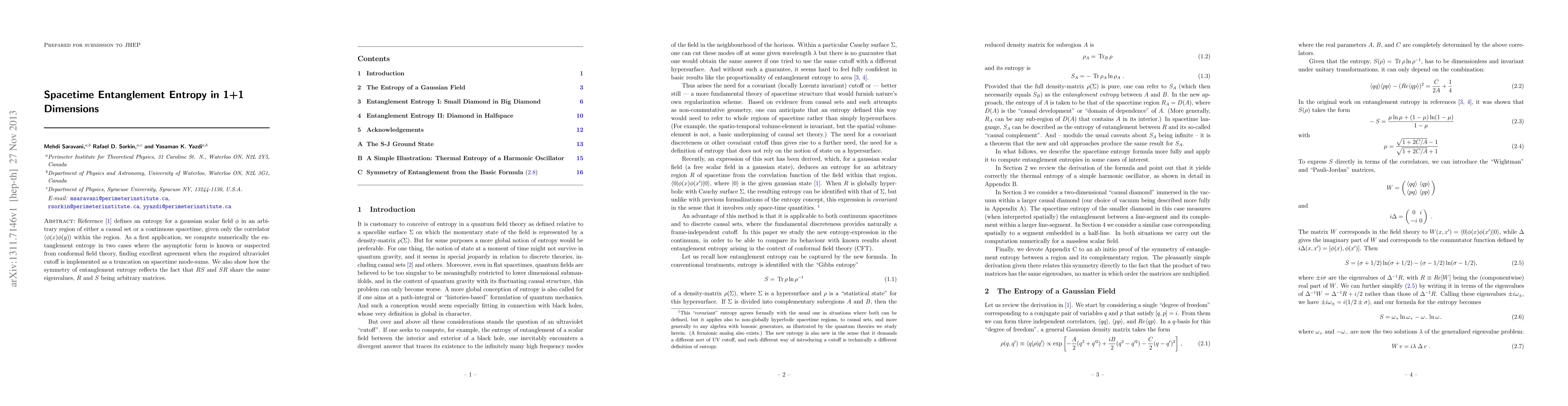 arXiv:1205.2953 defines an entropy for a gaussian scalar field $\phi$ in an arbitrary region of either a causal set or a continuous spacetime, given only the correlator $\langle\phi(x)\phi(y)\rangle$ within the region. As a first application, we compute numerically the entanglement entropy in two cases where the asymptotic form is known or suspected from conformal field theory, finding excellent agreement when the required ultraviolet cutoff is implemented as a truncation on spacetime mode-sums. We also show how the symmetry of entanglement entropy reflects the fact that $RS$ and $SR$ share the same eigenvalues, $R$ and $S$ being arbitrary matrices.