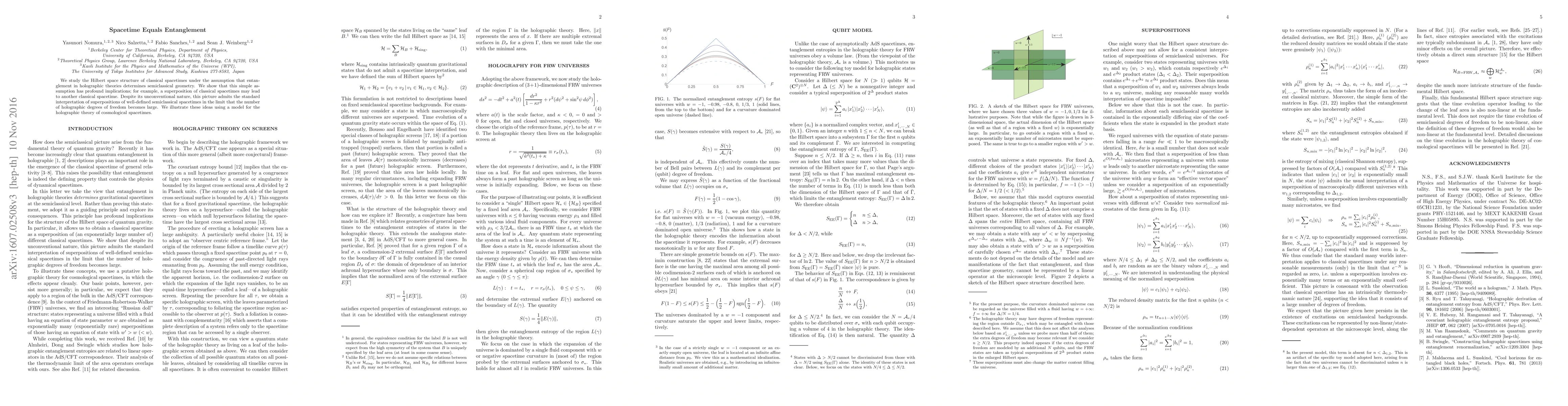 We study the Hilbert space structure of classical spacetimes under the assumption that entanglement in holographic theories determines semiclassical geometry. We show that this simple assumption has profound implications; for example, a superposition of classical spacetimes may lead to another classical spacetime. Despite its unconventional nature, this picture admits the standard interpretation of superpositions of well-defined semiclassical spacetimes in the limit that the number of holographic degrees of freedom becomes large. We illustrate these ideas using a model for the holographic theory of cosmological spacetimes.