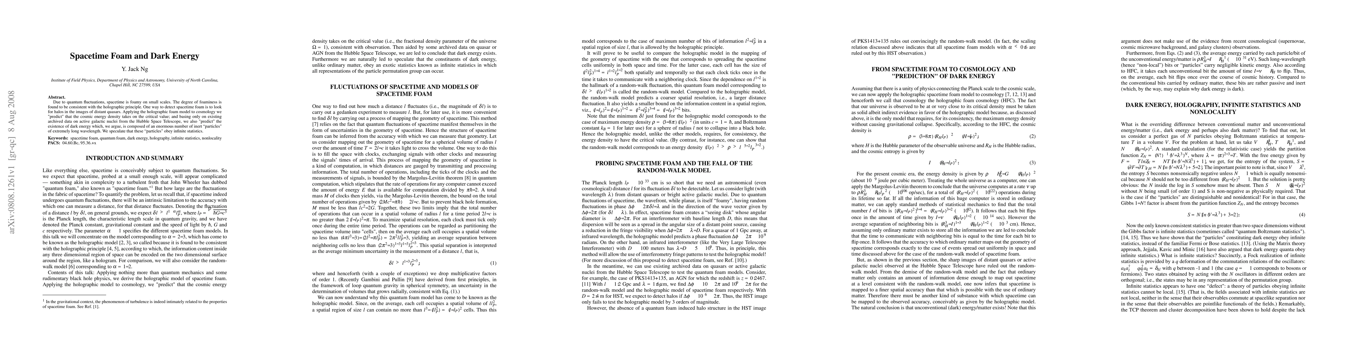 This paper explores the concept of spacetime foam due to quantum fluctuations and its consistency with the holographic principle. It predicts that dark energy, composed of long-wavelength inert particles, could be detected through halos in quasar images and is consistent with the critical cosmic energy density.