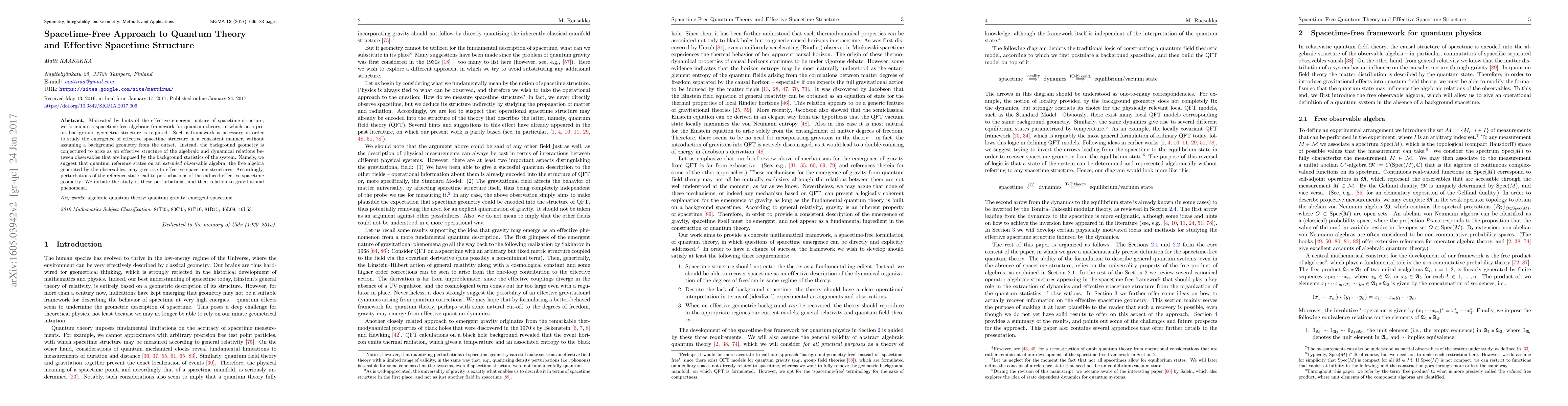 This paper proposes a spacetime-free algebraic framework for quantum theory to explore the emergence of effective spacetime structure without assuming a background geometry. It suggests that the geometry may arise from the algebraic and dynamical relations between observables, with quantum reference states potentially inducing effective spacetime geometries.