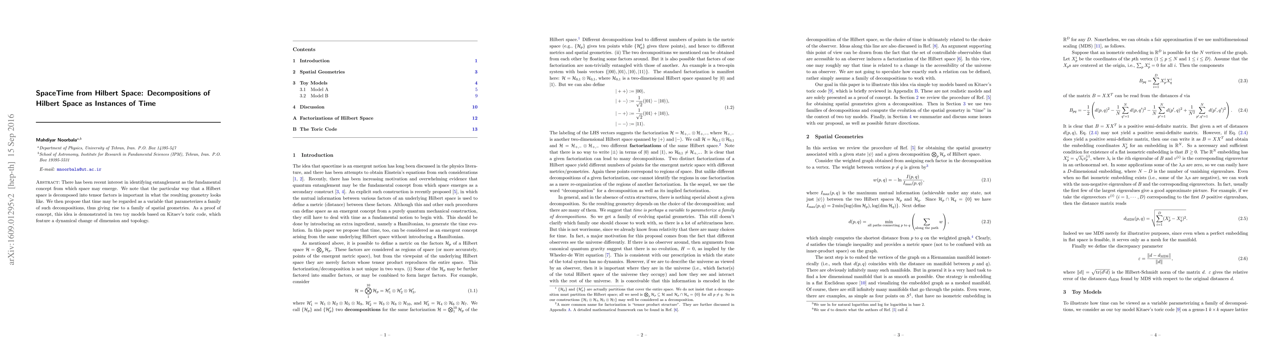 The paper proposes that time can be viewed as a parameter for a series of Hilbert space decompositions, leading to varying spatial geometries. This concept is illustrated through two toy models based on Kitaev's toric code, showcasing dynamic changes in dimension and topology.