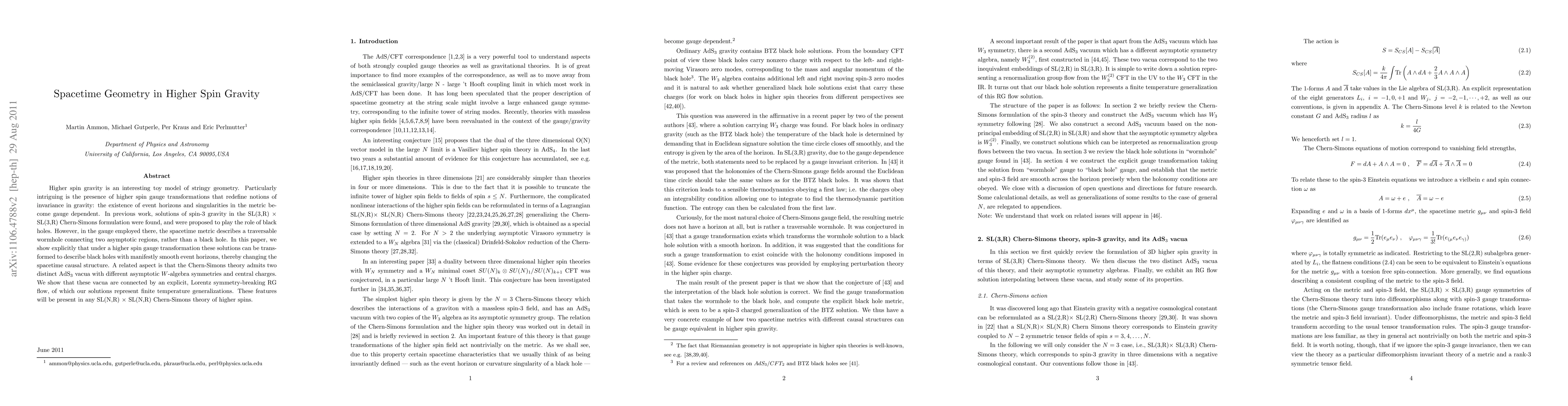 This paper explores higher spin gauge transformations in higher spin gravity, revealing that previously identified traversable wormhole solutions can be transformed into black holes with smooth event horizons, altering spacetime causal structure. It also demonstrates a connection between two distinct AdS_3 vacua via a Lorentz symmetry-breaking RG flow, suggesting these features are general in SL(N,R) x SL(N,R) Chern-Simons theories.
