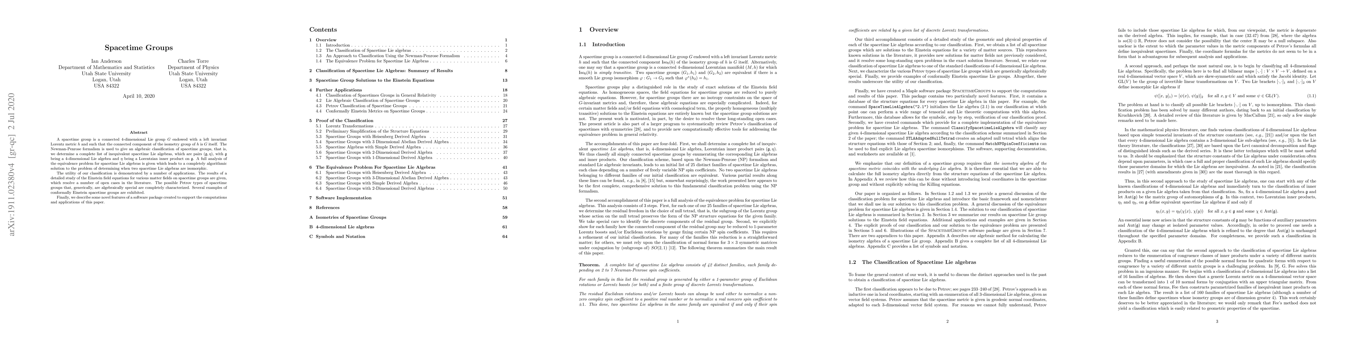The paper develops an algebraic classification of spacetime groups, providing a complete list of inequivalent spacetime Lie algebras and a method to determine when two spacetime Lie algebras are isomorphic.
