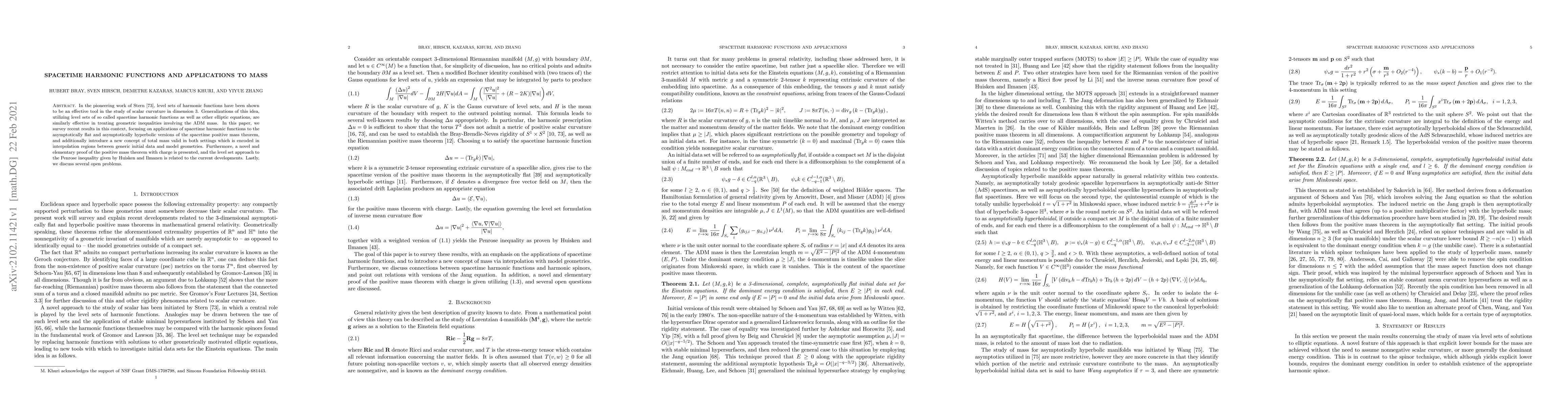 In the pioneering work of Stern, level sets of harmonic functions have been shown to be an effective tool in the study of scalar curvature in dimension 3. Generalizations of this idea, utilizing level sets of so called spacetime harmonic functions as well as other elliptic equations, are similarly effective in treating geometric inequalities involving the ADM mass. In this paper, we survey recent results in this context, focusing on applications of spacetime harmonic functions to the asymptotically flat and asymptotically hyperbolic versions of the spacetime positive mass theorem, and additionally introduce a new concept of total mass valid in both settings which is encoded in interpolation regions between generic initial data and model geometries. Furthermore, a novel and elementary proof of the positive mass theorem with charge is presented, and the level set approach to the Penrose inequality given by Huisken and Ilmanen is related to the current developments. Lastly, we discuss several open problems.