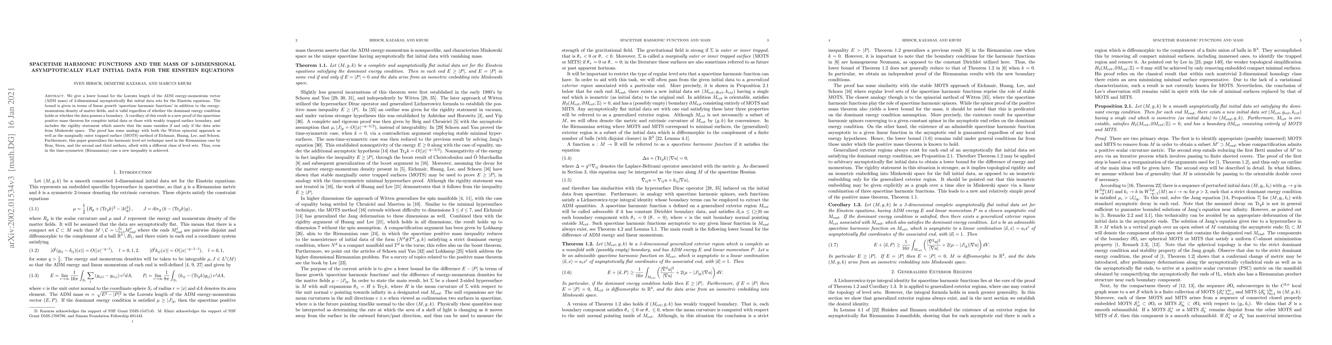 We give a lower bound for the Lorentz length of the ADM energy-momentum vector (ADM mass) of 3-dimensional asymptotically flat initial data sets for the Einstein equations. The bound is given in terms of linear growth `spacetime harmonic functions' in addition to the energy-momentum density of matter fields, and is valid regardless of whether the dominant energy condition holds or whether the data possess a boundary. A corollary of this result is a new proof of the spacetime positive mass theorem for complete initial data or those with weakly trapped surface boundary, and includes the rigidity statement which asserts that the mass vanishes if and only if the data arise from Minkowski space. The proof has some analogy with both the Witten spinorial approach as well as the marginally outer trapped surface (MOTS) method of Eichmair, Huang, Lee, and Schoen. Furthermore, this paper generalizes the harmonic level set technique used in the Riemannian case by Bray, Stern, and the second and third authors, albeit with a different class of level sets. Thus, even in the time-symmetric (Riemannian) case a new inequality is achieved.