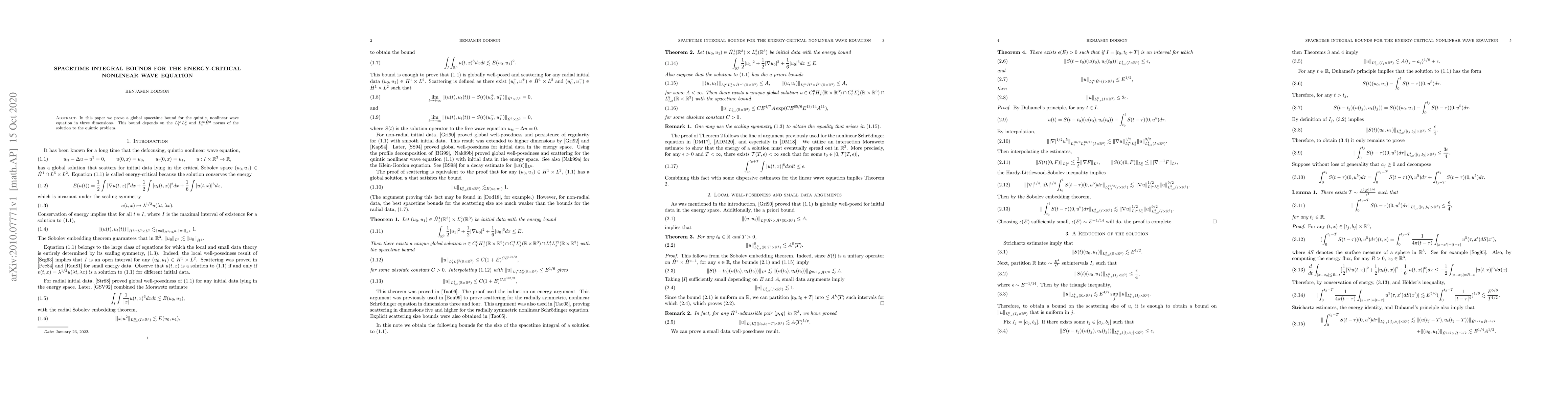 Researchers prove a global spacetime bound for the quintic nonlinear wave equation in 3D, which depends on the solution's energy norms.