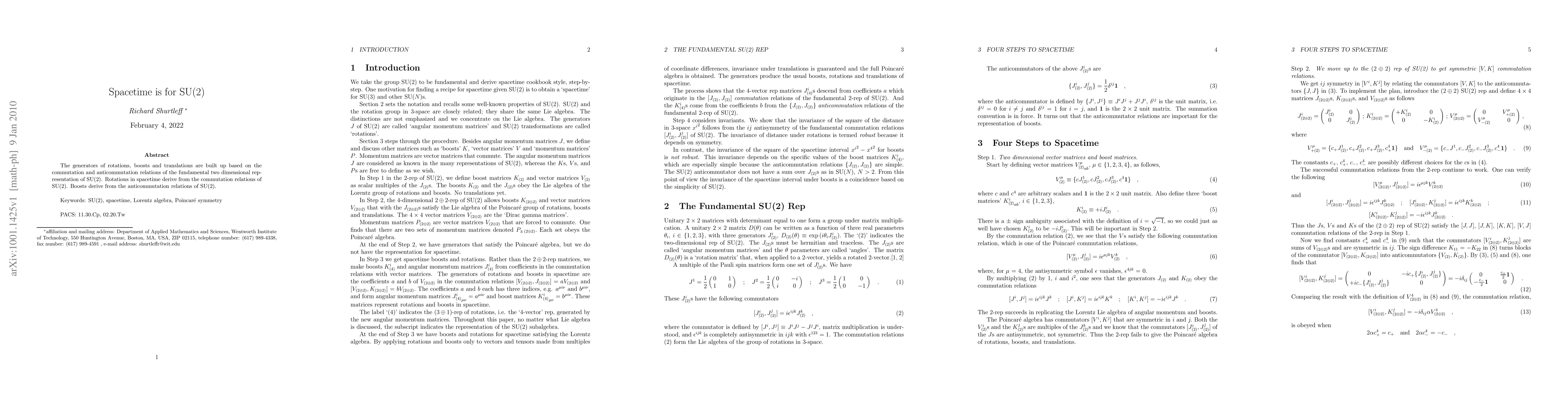 This paper shows that rotations in spacetime can be derived from SU(2) commutation relations, while boosts come from its anticommutation relations.
