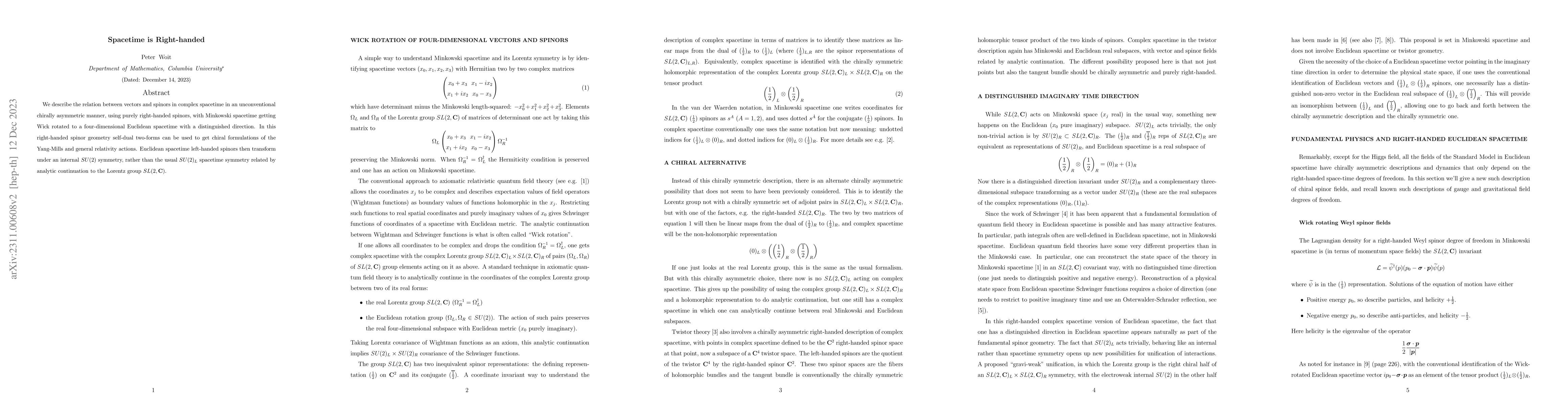We describe the relation between vectors and spinors in complex spacetime in an unconventional chirally asymmetric manner, using purely right-handed spinors, with Minkowski spacetime getting Wick rotated to a four-dimensional Euclidean spacetime with a distinguished direction. In this right-handed spinor geometry self-dual two-forms can be used to get chiral formulations of the Yang-Mills and general relativity actions. Euclidean spacetime left-handed spinors then transform under an internal $SU(2)$ symmetry, rather than the usual $SU(2)_L$ spacetime symmetry related by analytic continuation to the Lorentz group $SL(2,\mathbf C)$.