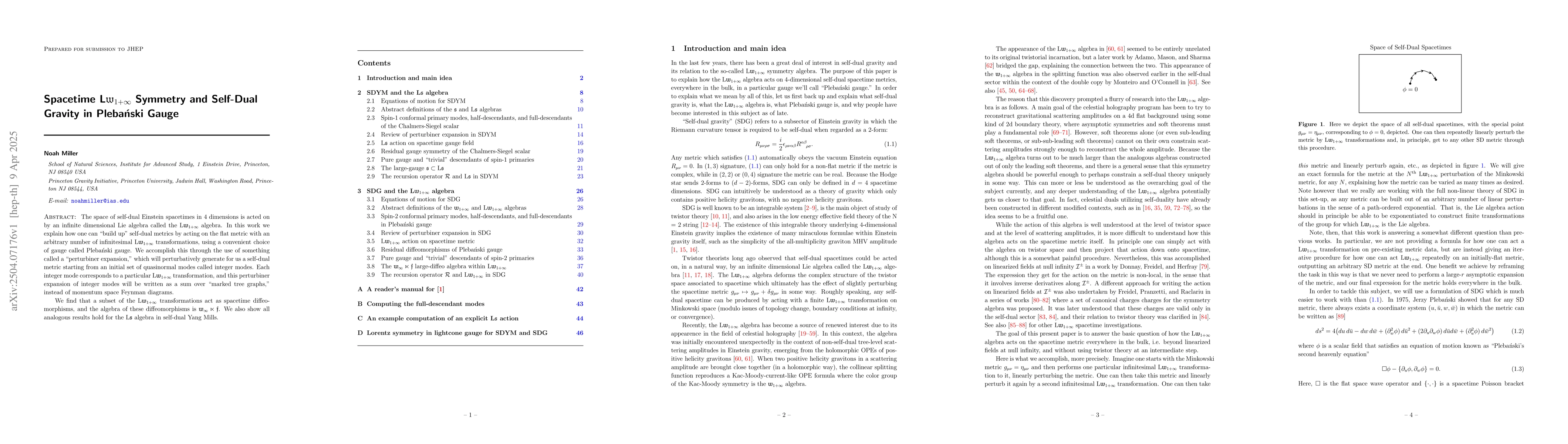 This paper explains how to generate self-dual Einstein spacetimes using a Lie algebra called $Lw_{1+ty}$ algebra through perturbative methods, revealing that certain transformations act as diffeomorphisms with a specific algebraic structure.