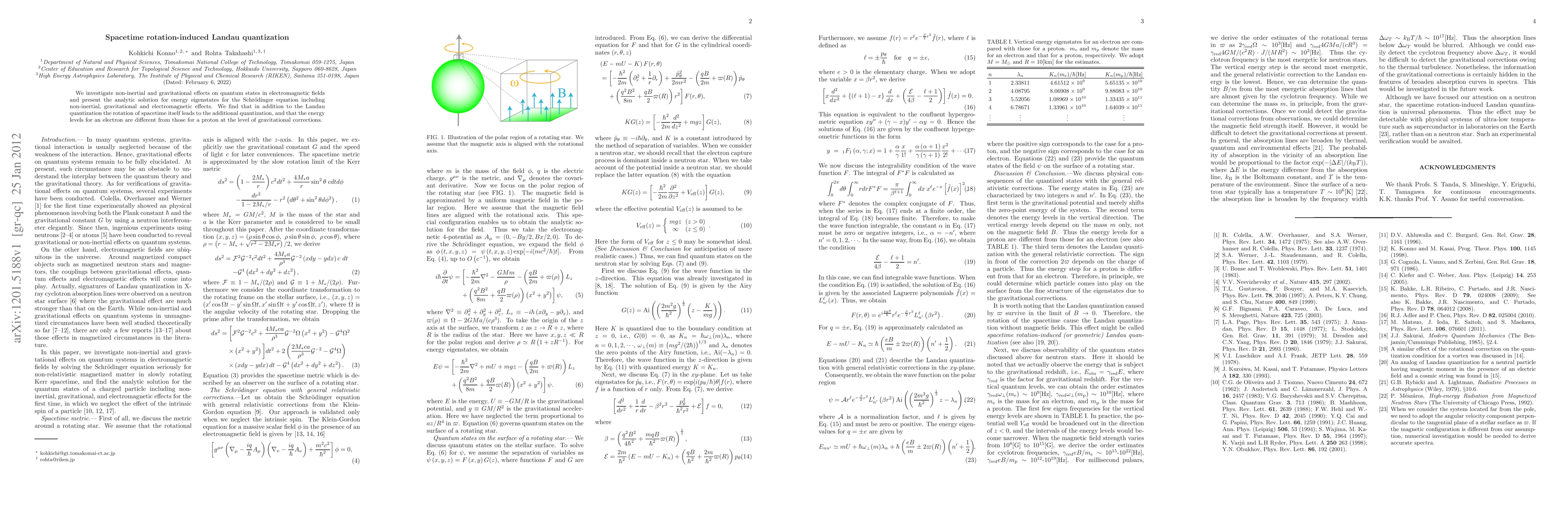 This paper explores the impact of spacetime rotation and gravitational fields on quantum states in electromagnetic fields, revealing an additional quantization effect beyond the usual Landau quantization. The study provides an analytic solution for the Schrödinger equation, showing that gravitational corrections lead to distinct energy levels for electrons and protons.