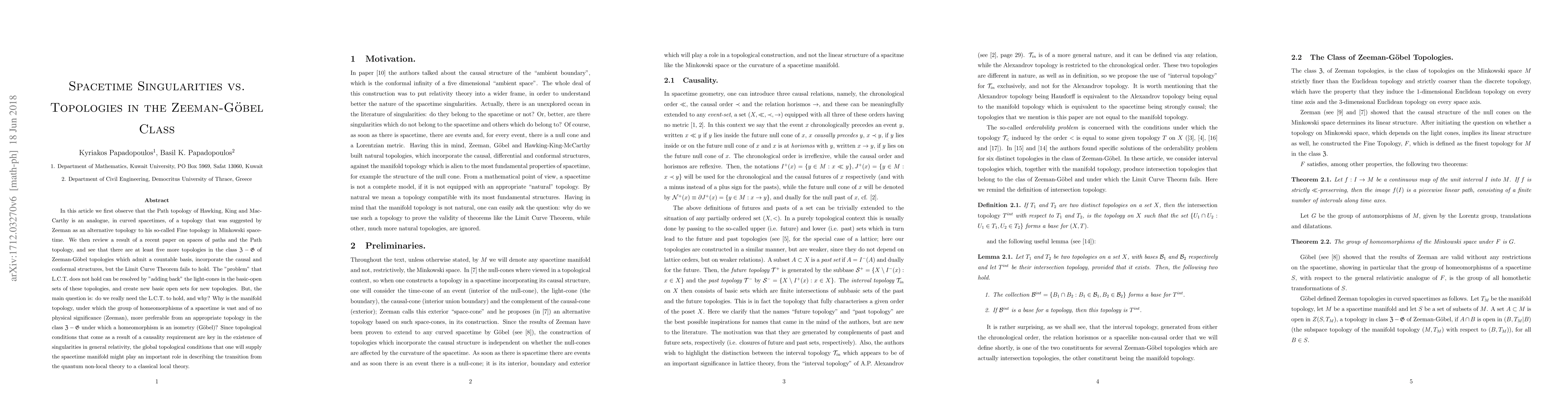 In this article we first observe that the Path topology of Hawking, King and MacCarthy is an analogue, in curved spacetimes, of a topology that was suggested by Zeeman as an alternative topology to his so-called Fine topology in Minkowski spacetime. We then review a result of a recent paper on spaces of paths and the Path topology, and see that there are at least five more topologies in the class $\mathfrak{Z}-\mathfrak{G}$ of Zeeman-G\"obel topologies which admit a countable basis, incorporate the causal and conformal structures, but the Limit Curve Theorem fails to hold. The "problem" that L.C.T. does not hold can be resolved by "adding back" the light-cones in the basic-open sets of these topologies, and create new basic open sets for new topologies. But, the main question is: do we really need the L.C.T. to hold, and why? Why is the manifold topology, under which the group of homeomorphisms of a spacetime is vast and of no physical significance (Zeeman), more preferable from an appropriate topology in the class $\mathfrak{Z}-\mathfrak{G}$ under which a homeomorphism is an isometry (G\"obel)? Since topological conditions that come as a result of a causality requirement are key in the existence of singularities in general relativity, the global topological conditions that one will supply the spacetime manifold might play an important role in describing the transition from the quantum non-local theory to a classical local theory.