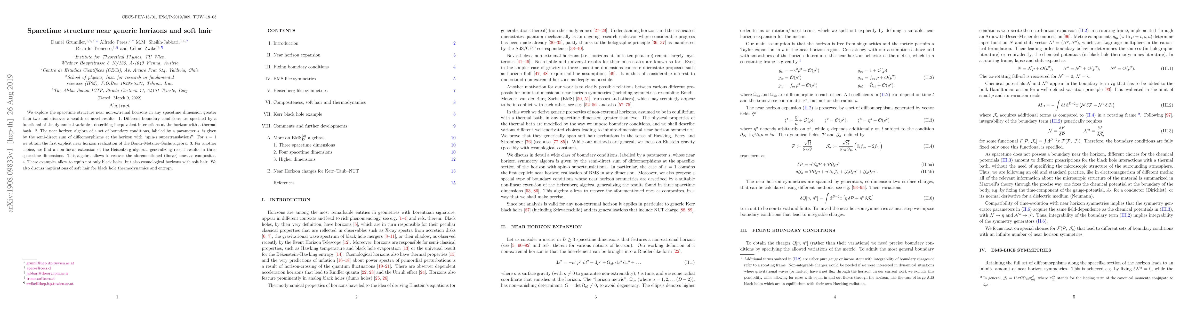 This paper investigates the spacetime structure near non-extremal horizons, revealing that different boundary conditions are specified by a functional of dynamical variables. It identifies the near horizon algebra as a semi-direct sum of diffeomorphisms and "spin-$s$ supertranslations," with implications for black hole and cosmological horizons' soft hair, and discusses its effects on black hole thermodynamics and entropy.