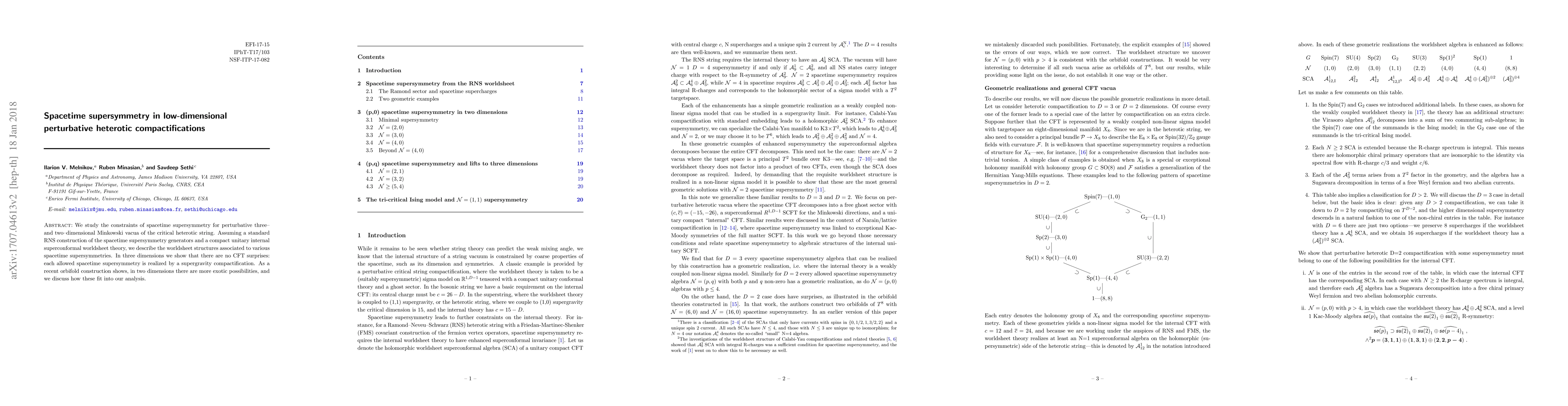 This paper investigates the constraints of spacetime supersymmetry in low-dimensional perturbative heterotic string compactifications, demonstrating that three-dimensional Minkowski vacua realize each allowed spacetime supersymmetry through supergravity compactifications. In two dimensions, it explores more exotic possibilities arising from orbifold constructions and their compatibility with the analysis.