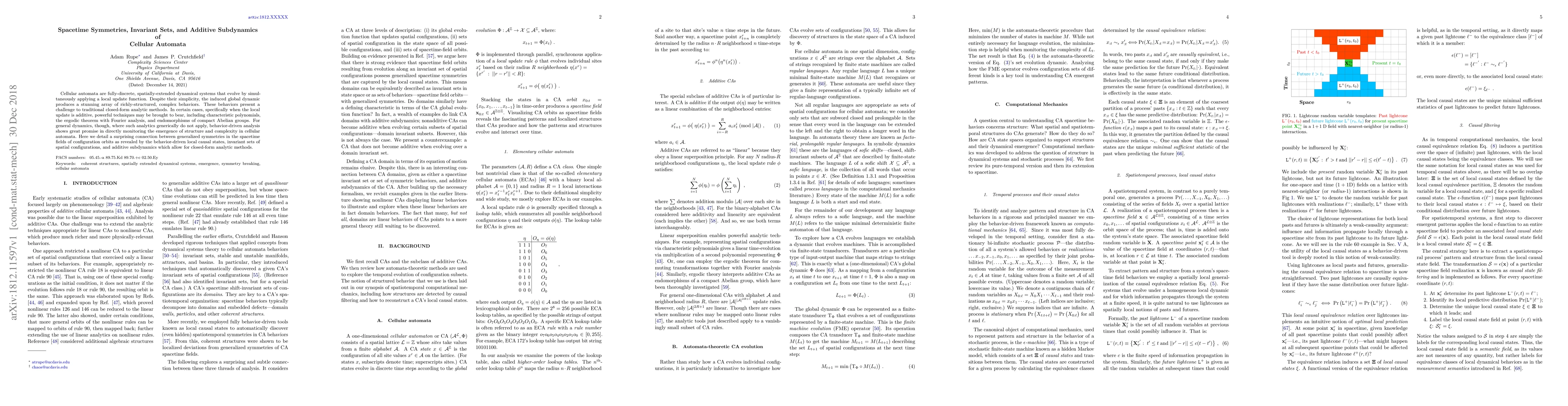 This paper explores the complex behaviors of cellular automata, focusing on additive local updates that allow for powerful analytical techniques. It reveals a connection between spacetime symmetries, invariant sets, and additive subdynamics, providing a new framework for understanding the structure and complexity in these systems.
