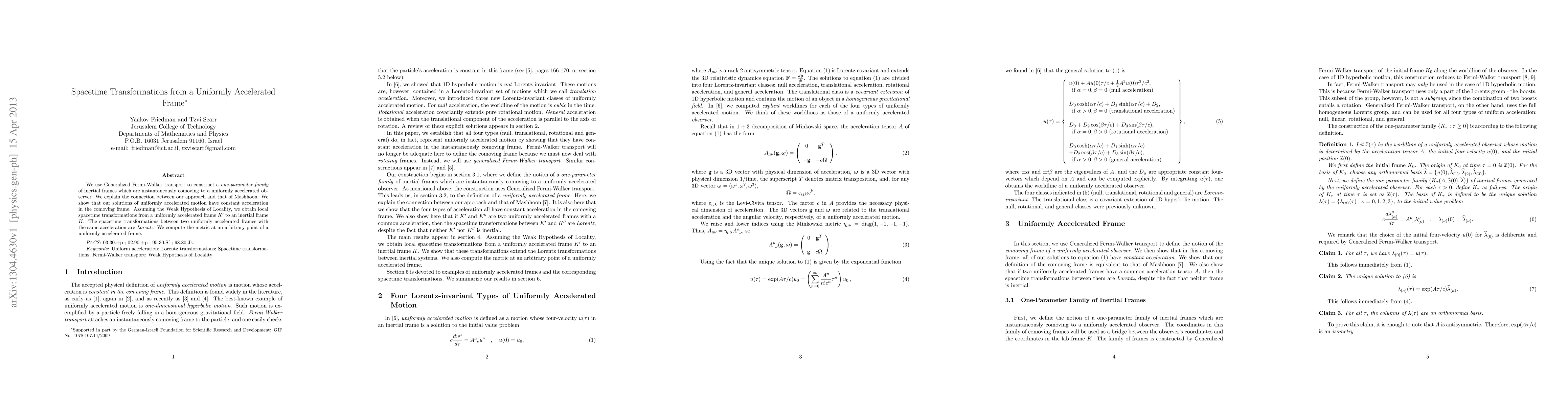 We use Generalized Fermi-Walker transport to construct a one-parameter family of inertial frames which are instantaneously comoving to a uniformly accelerated observer. We explain the connection between our approach and that of Mashhoon. We show that our solutions of uniformly accelerated motion have constant acceleration in the comoving frame. Assuming the Weak Hypothesis of Locality, we obtain local spacetime transformations from a uniformly accelerated frame $K'$ to an inertial frame $K$. The spacetime transformations between two uniformly accelerated frames with the same acceleration are Lorentz. We compute the metric at an arbitrary point of a uniformly accelerated frame.
