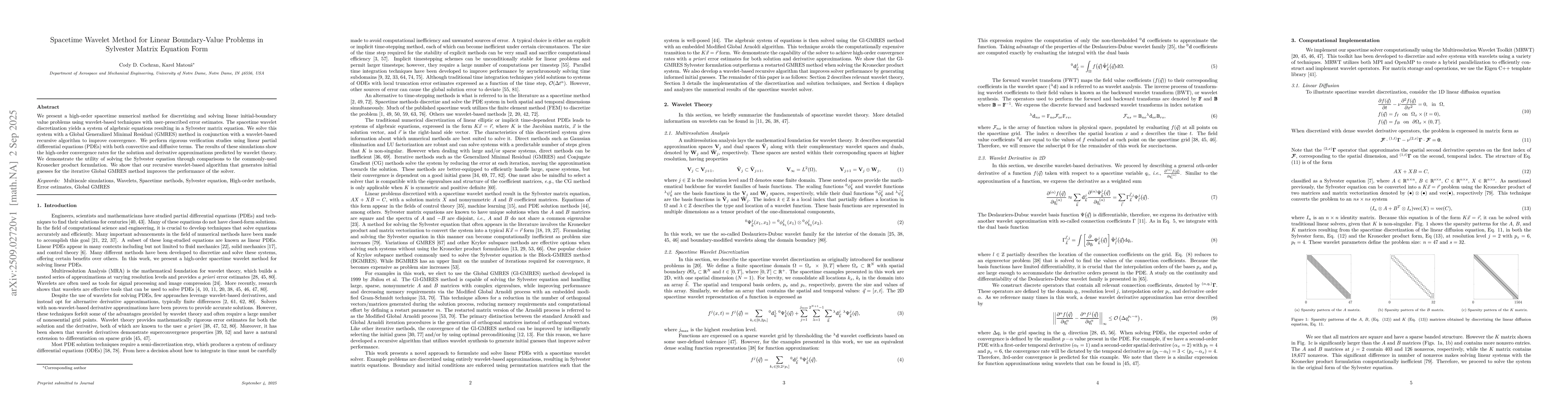 We present a high-order spacetime numerical method for discretizing and solving linear initial-boundary value problems using wavelet-based techniques with user-prescribed error estimates. The spacetime wavelet discretization yields a system of algebraic equations resulting in a Sylvester matrix equation. We solve this system with a Global Generalized Minimal Residual (GMRES) method in conjunction with a wavelet-based recursive algorithm to improve convergence. We perform rigorous verification studies using linear partial differential equations (PDEs) with both convective and diffusive terms. The results of these simulations show the high-order convergence rates for the solution and derivative approximations predicted by wavelet theory. We demonstrate the utility of solving the Sylvester equation through comparisons to the commonly-used Kronecker product formulation. We show that our recursive wavelet-based algorithm that generates initial guesses for the iterative Global GMRES method improves the performance of the solver.