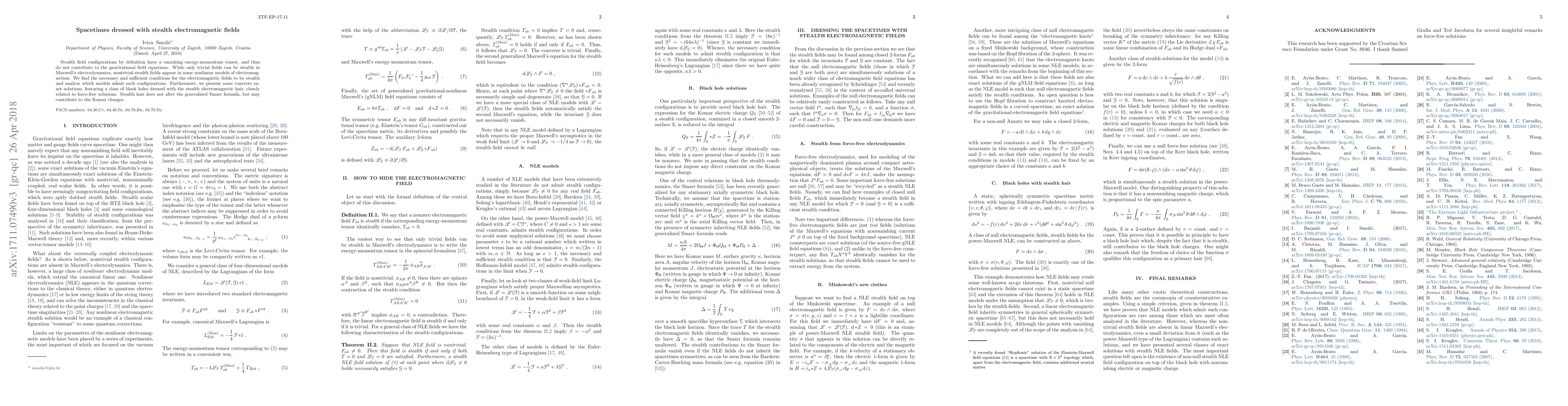 This paper investigates the conditions under which electromagnetic fields can be "stealth," meaning they do not contribute to gravitational field equations, and identifies nonlinear electromagnetism models that allow such configurations. It also presents exact solutions of black holes with stealth electromagnetic fields, which do not affect the generalized Smarr formula but may influence Komar charges.