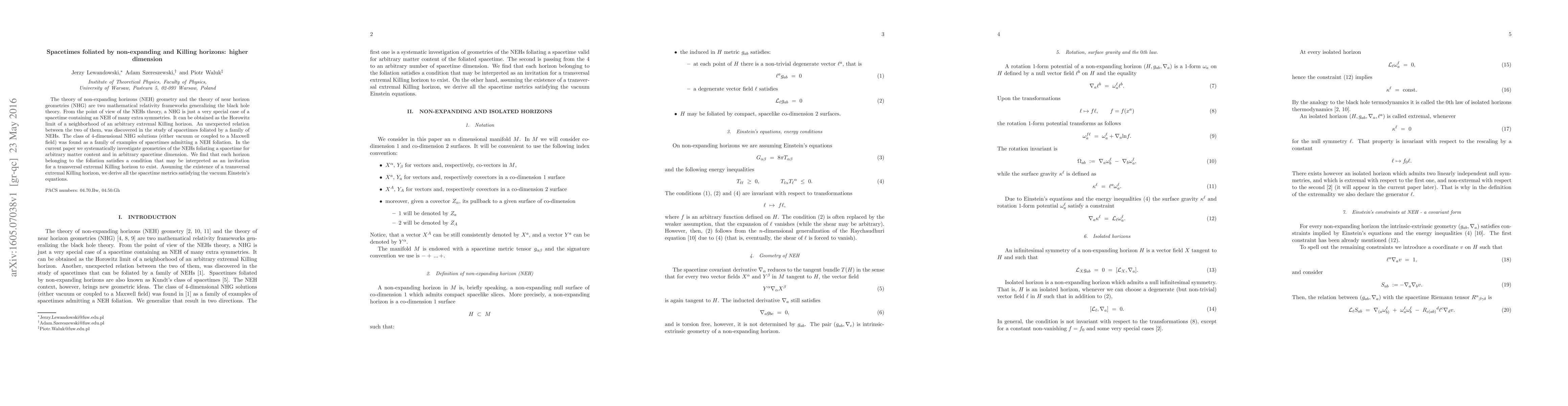 This paper investigates spacetimes foliated by non-expanding horizons (NEH) in arbitrary dimensions, establishing connections between NEHs and near horizon geometries (NHG). It finds that NEHs imply the existence of transversal extremal Killing horizons and derives metrics satisfying vacuum Einstein's equations.