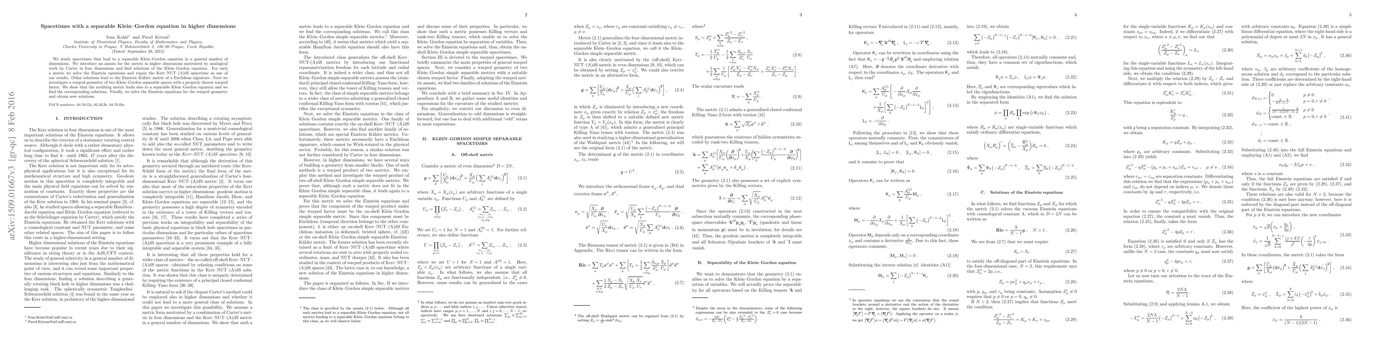 We study spacetimes that lead to a separable Klein-Gordon equation in a general dimension. We introduce an ansatz for the metric in higher dimensions motivated by analogical work by Carter in four dimensions and find solutions of the Klein-Gordon equation. For such a metric we solve the Einstein equations and regain the Kerr-NUT-(A)dS spacetime as one of our results. Other solutions lead to the Einstein-K\"ahler metric of a Euclidean signature. Next we investigate a warped geometry of two Klein-Gordon separable spaces with a properly chosen warped factor. We show that the resulting metric leads also to a separable Klein--Gordon equation and we find the corresponding solutions. Finally, we solve the Einstein equations for the warped geometry and obtain new solutions.