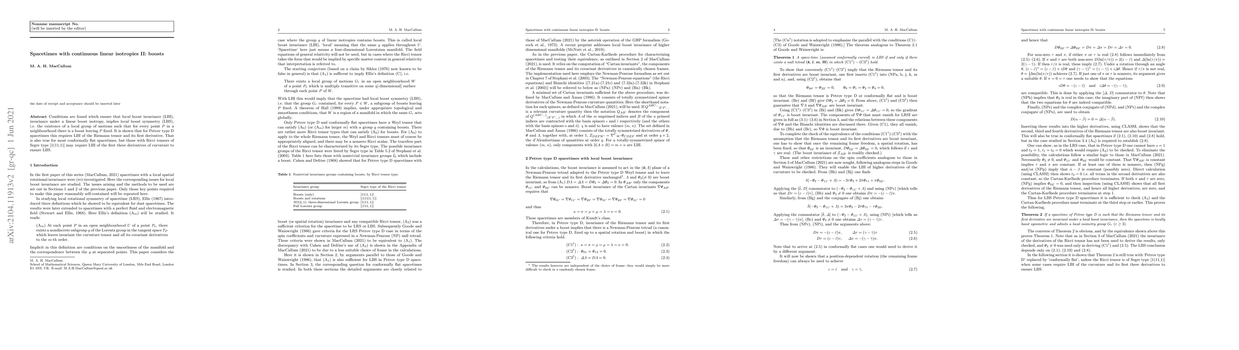 Conditions are found which ensure that local boost invariance (LBI), invariance under a linear boost isotropy, implies local boost symmetry (LBS), i.e. the existence of a local group of motions such that for every point $P$ in a neighbourhood there is a boost leaving $P$ fixed. It is shown that for Petrov type D spacetimes this requires LBI of the Riemann tensor and its first derivative. That is also true for most conformally flat spacetimes, but those with Ricci tensors of Segre type [1(11,1)] may require LBI of the first three derivatives of curvature to ensure LBS.