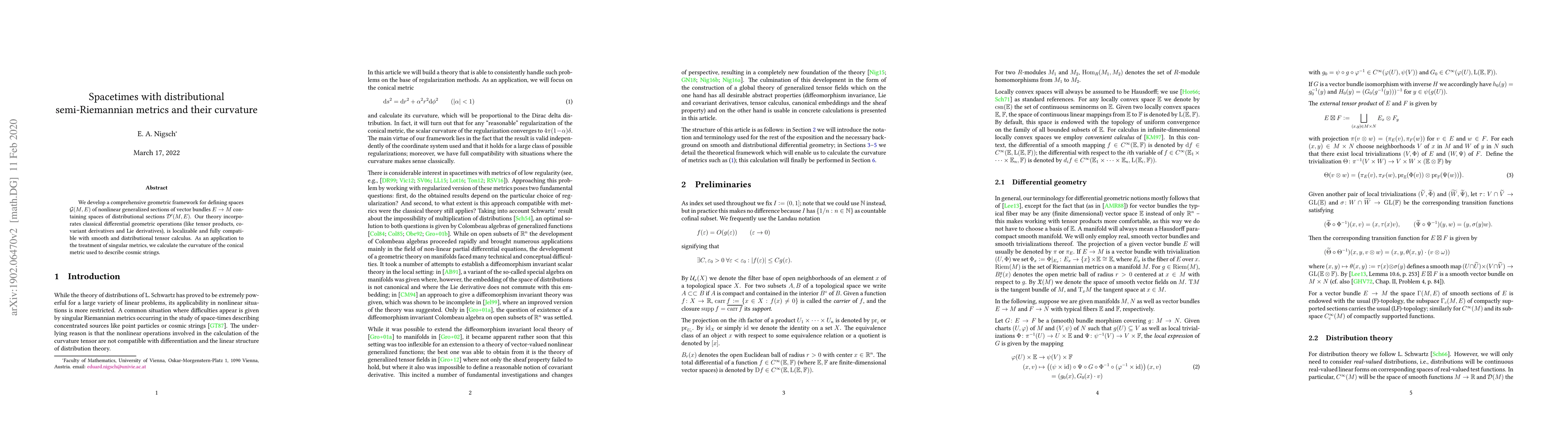 Researchers develop a geometric framework to study spaces with distributional semi-Riemannian metrics, enabling calculations of curvature in singular metric cases like cosmic strings.