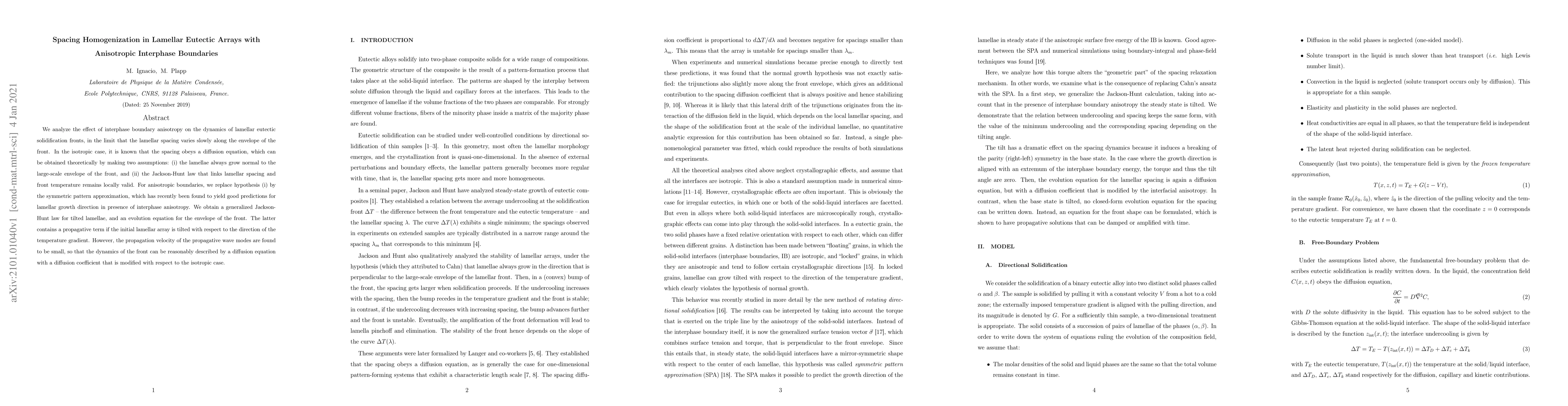This paper investigates how anisotropic interphase boundaries affect the dynamics of lamellar eutectic solidification fronts, deriving a generalized Jackson-Hunt law for tilted lamellae and showing that the front's evolution can still be described by a modified diffusion equation despite the presence of propagative wave modes.