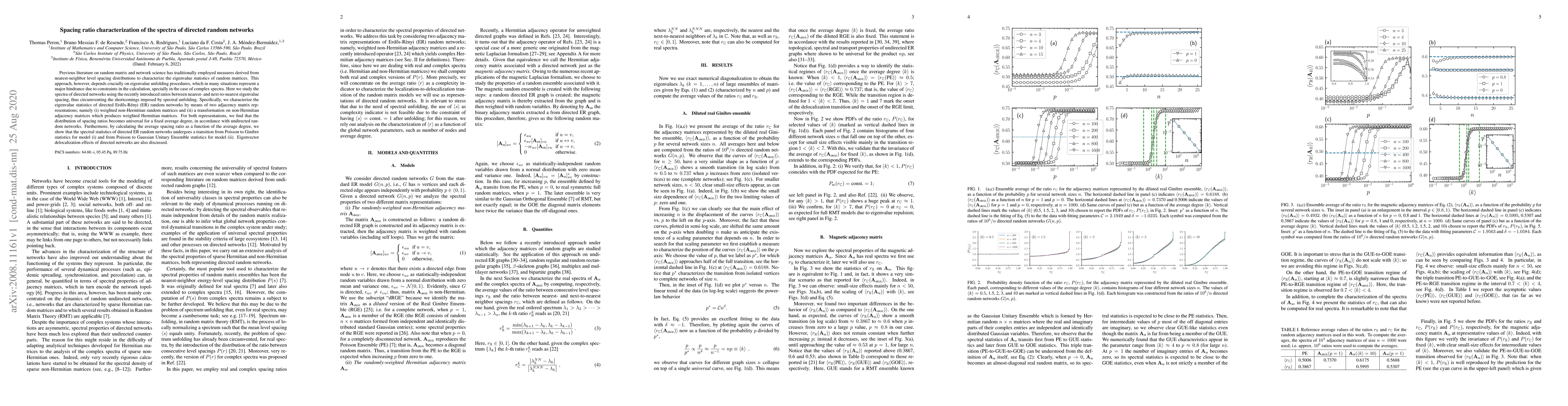 Previous literature on random matrix and network science has traditionally employed measures derived from nearest-neighbor level spacing distributions to characterize the eigenvalue statistics of random matrices. This approach, however, depends crucially on eigenvalue unfolding procedures, which in many situations represent a major hindrance due to constraints in the calculation, specially in the case of complex spectra. Here we study the spectra of directed networks using the recently introduced ratios between nearest- and next-to-nearest eigenvalue spacing, thus circumventing the shortcomings imposed by spectral unfolding. Specifically, we characterize the eigenvalue statistics of directed Erd\H{o}s-R\'enyi (ER) random networks by means of two adjacency matrix representations; namely (i) weighted non-Hermitian random matrices and (ii) a transformation on non-Hermitian adjacency matrices which produces weighted Hermitian matrices. For both representations, we find that the distribution of spacing ratios becomes universal for a fixed average degree, in accordance with undirected random networks. Furthermore, by calculating the average spacing ratio as a function of the average degree, we show that the spectral statistics of directed ER random networks undergoes a transition from Poisson to Ginibre statistics for model (i) and from Poisson to Gaussian Unitary Ensemble statistics for model (ii). Eigenvector delocalization effects of directed networks are also discussed.