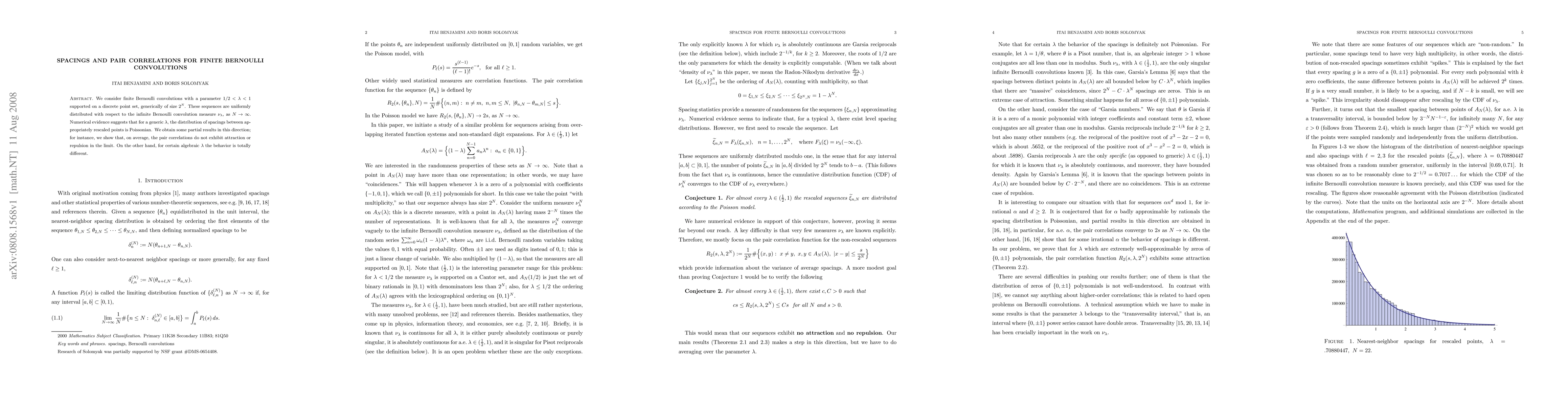 This paper investigates the distribution of spacings and pair correlations in finite Bernoulli convolutions with parameters $1/2 < r < 1$. It finds that, on average, spacings tend to follow a Poisson distribution, while pair correlations do not show attraction or repulsion as $N$ increases. However, for specific algebraic values of $r$, different behavior is observed.