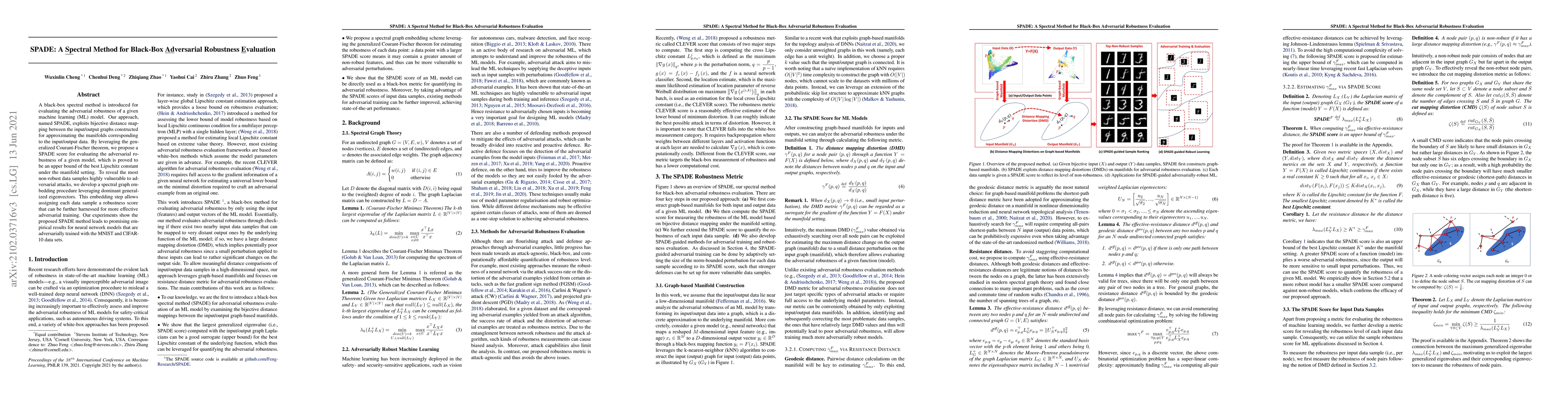 A black-box spectral method is introduced for evaluating the adversarial robustness of a given machine learning (ML) model. Our approach, named SPADE, exploits bijective distance mapping between the input/output graphs constructed for approximating the manifolds corresponding to the input/output data. By leveraging the generalized Courant-Fischer theorem, we propose a SPADE score for evaluating the adversarial robustness of a given model, which is proved to be an upper bound of the best Lipschitz constant under the manifold setting. To reveal the most non-robust data samples highly vulnerable to adversarial attacks, we develop a spectral graph embedding procedure leveraging dominant generalized eigenvectors. This embedding step allows assigning each data sample a robustness score that can be further harnessed for more effective adversarial training. Our experiments show the proposed SPADE method leads to promising empirical results for neural network models that are adversarially trained with the MNIST and CIFAR-10 data sets.