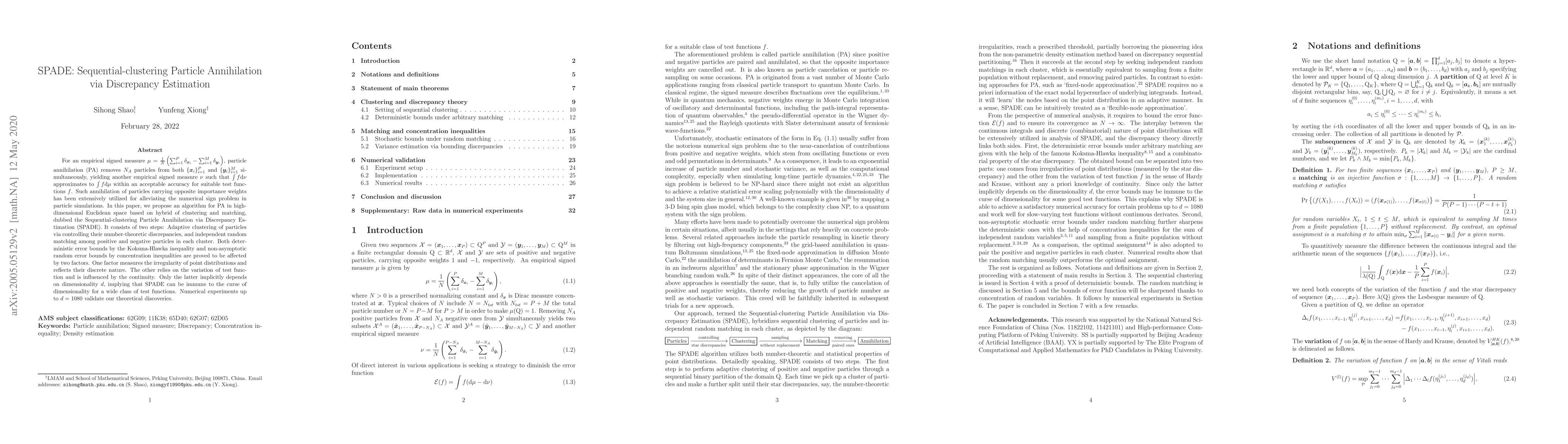 The paper introduces SPADE, an algorithm for Sequential-clustering Particle Annihilation via Discrepancy Estimation in high-dimensional Euclidean space. It combines adaptive clustering of particles based on number-theoretic discrepancies with random matching of positive and negative particles in each cluster. SPADE provides deterministic and random error bounds, proven to be influenced by point distribution irregularity and test function variation. The method is theoretically shown to be robust against the curse of dimensionality for a wide range of test functions, validated through numerical experiments up to 1080 dimensions.