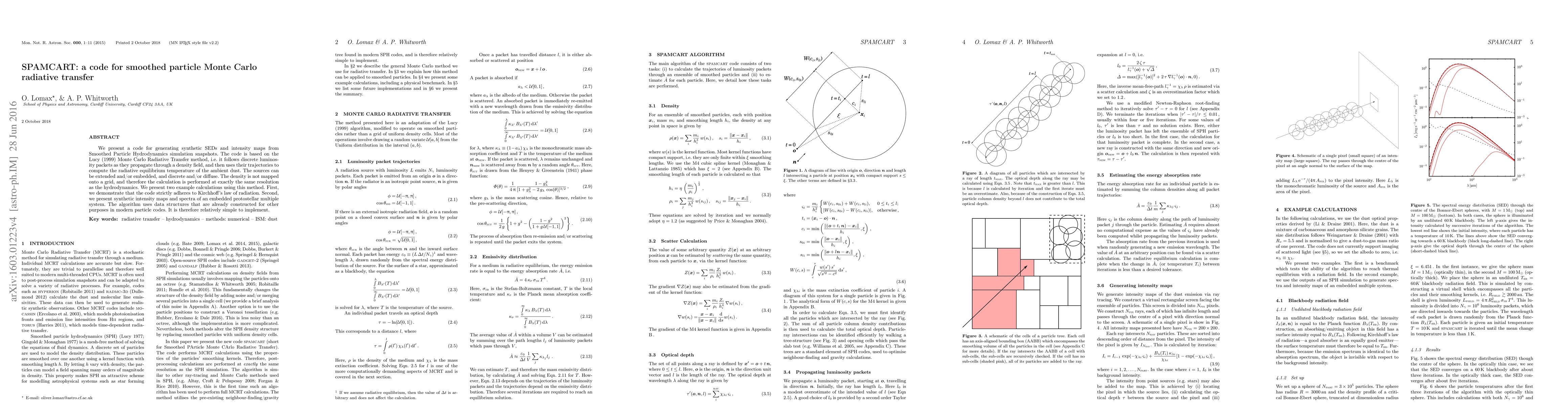 SPAMCART is a code for radiative transfer based on smoothed particle hydrodynamics, employing the Lucy Monte Carlo method to simulate synthetic spectral energy distributions and intensity maps. It adheres to Kirchhoff's law and demonstrates its utility through synthetic observations of a protostellar system.