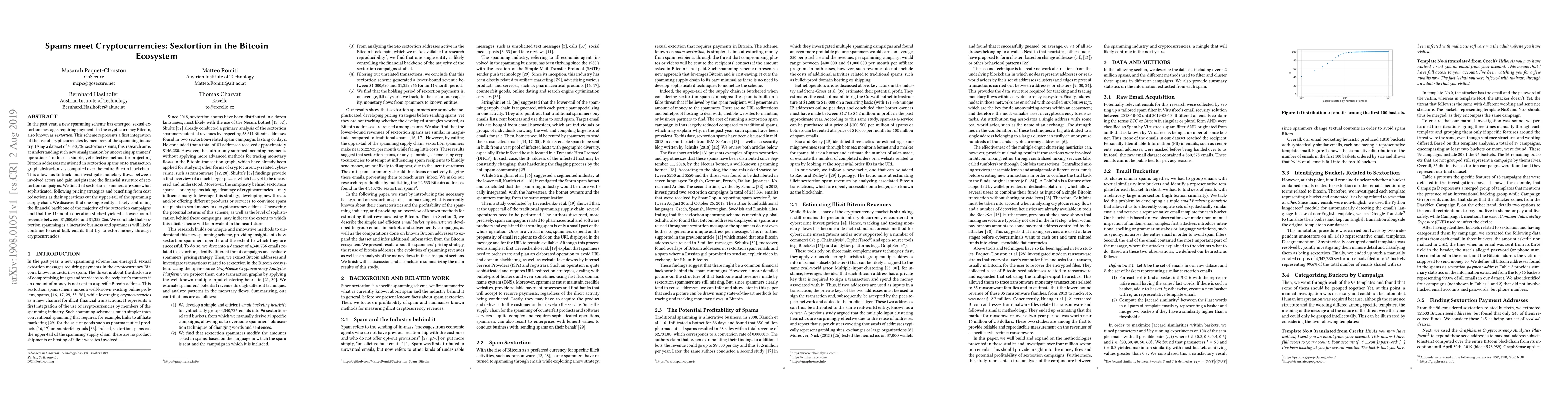 Sextortion spammers use Bitcoin to extort money from victims in a lucrative business; one entity likely controls majority of campaigns, yielding $1,300,620-$1,352,266 in revenue.