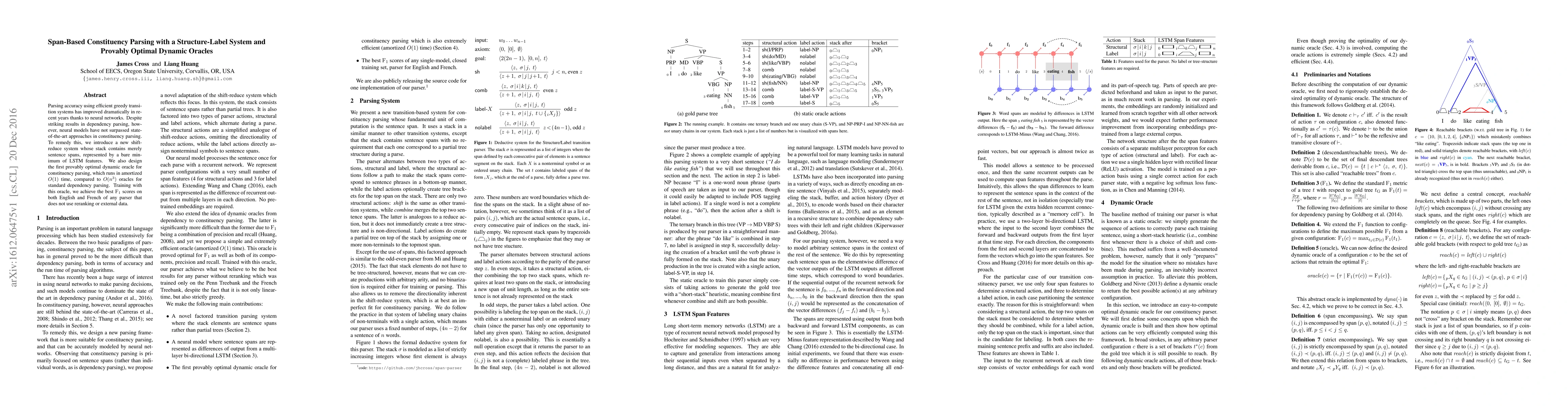 The paper proposes a span-based constituency parser that employs a minimal LSTM-feature representation for sentence spans and introduces a provably optimal dynamic oracle, achieving state-of-the-art F1 scores in constituency parsing for English and French without using reranking or external data. The oracle operates in amortized O(1) time, significantly improving efficiency.