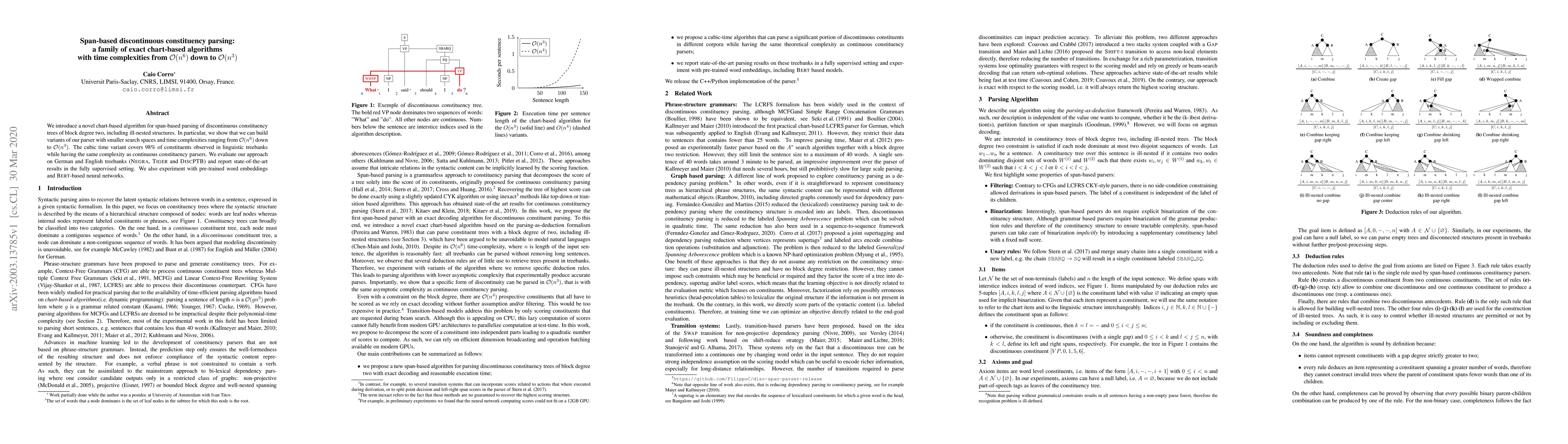 This paper proposes a new family of chart-based algorithms for parsing discontinuous constituency trees, achieving time complexities from O(n^6) to O(n^3). The cubic variant, comparable in complexity to continuous parsers, handles 98% of constituents in treebanks and outperforms others on German and English datasets.