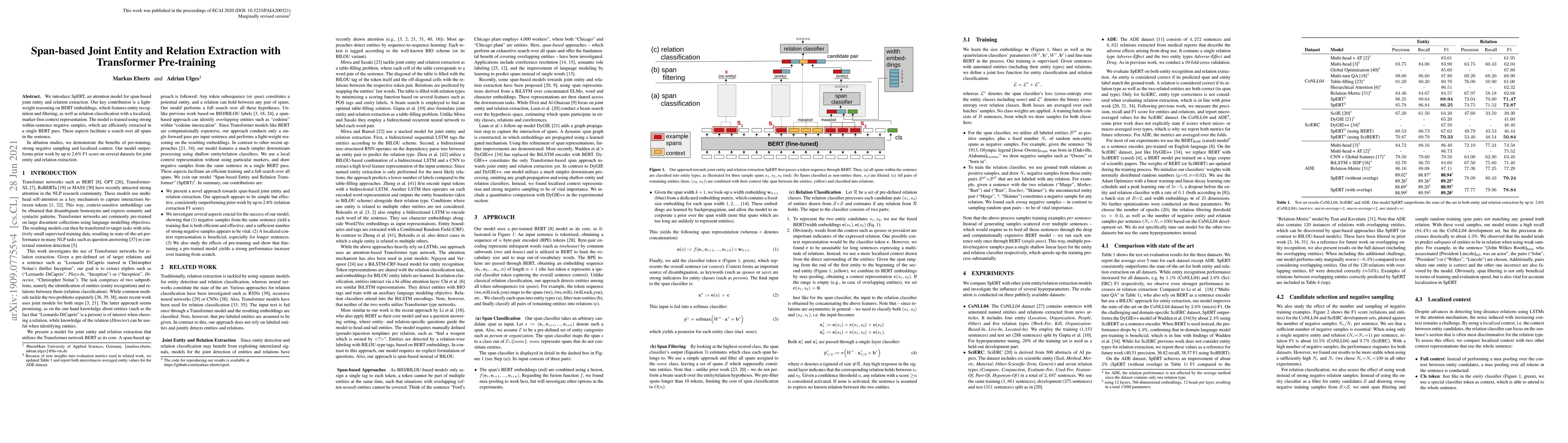 SpERT is a transformer-based model for joint entity and relation extraction that leverages lightweight reasoning on BERT embeddings. It achieves state-of-the-art results by incorporating pre-training, strong negative sampling, and localized context, improving F1 scores by up to 2.6% on multiple datasets.