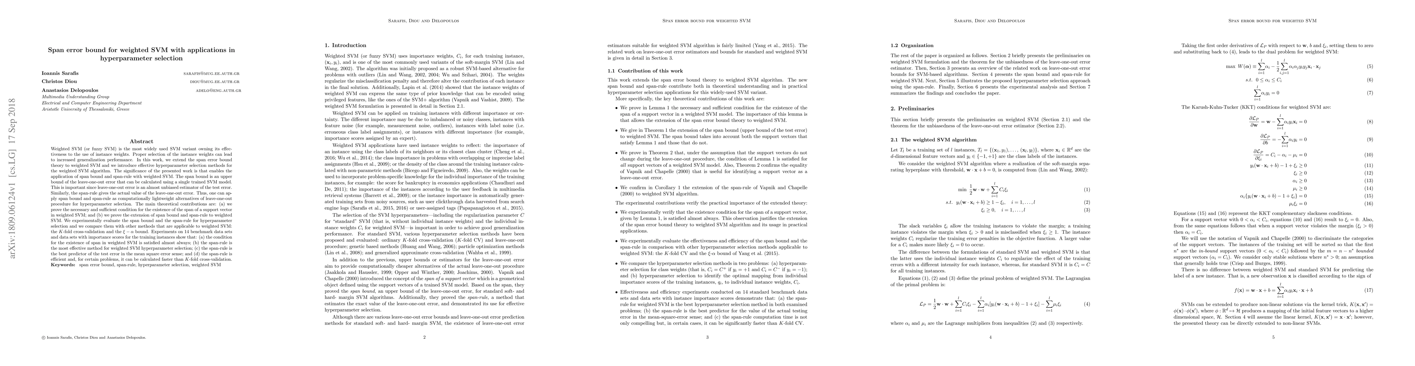 Weighted SVM (or fuzzy SVM) is the most widely used SVM variant owning its effectiveness to the use of instance weights. Proper selection of the instance weights can lead to increased generalization performance. In this work, we extend the span error bound theory to weighted SVM and we introduce effective hyperparameter selection methods for the weighted SVM algorithm. The significance of the presented work is that enables the application of span bound and span-rule with weighted SVM. The span bound is an upper bound of the leave-one-out error that can be calculated using a single trained SVM model. This is important since leave-one-out error is an almost unbiased estimator of the test error. Similarly, the span-rule gives the actual value of the leave-one-out error. Thus, one can apply span bound and span-rule as computationally lightweight alternatives of leave-one-out procedure for hyperparameter selection. The main theoretical contributions are: (a) we prove the necessary and sufficient condition for the existence of the span of a support vector in weighted SVM; and (b) we prove the extension of span bound and span-rule to weighted SVM. We experimentally evaluate the span bound and the span-rule for hyperparameter selection and we compare them with other methods that are applicable to weighted SVM: the $K$-fold cross-validation and the ${\xi}-{\alpha}$ bound. Experiments on 14 benchmark data sets and data sets with importance scores for the training instances show that: (a) the condition for the existence of span in weighted SVM is satisfied almost always; (b) the span-rule is the most effective method for weighted SVM hyperparameter selection; (c) the span-rule is the best predictor of the test error in the mean square error sense; and (d) the span-rule is efficient and, for certain problems, it can be calculated faster than $K$-fold cross-validation.