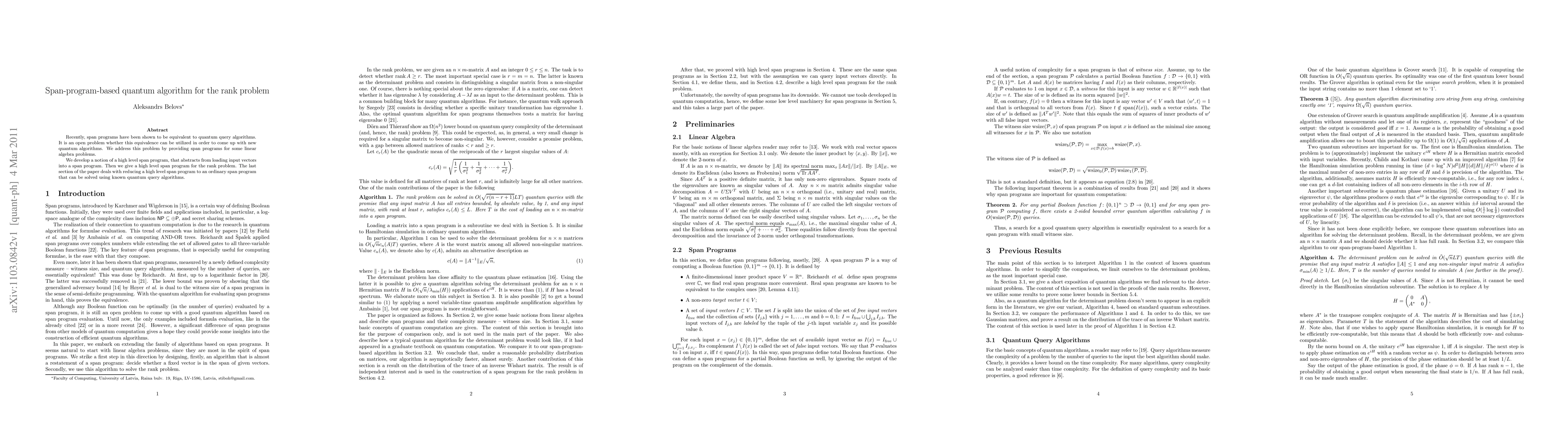 Recently, span programs have been shown to be equivalent to quantum query algorithms. It is an open problem whether this equivalence can be utilized in order to come up with new quantum algorithms. We address this problem by providing span programs for some linear algebra problems. We develop a notion of a high level span program, that abstracts from loading input vectors into a span program. Then we give a high level span program for the rank problem. The last section of the paper deals with reducing a high level span program to an ordinary span program that can be solved using known quantum query algorithms.