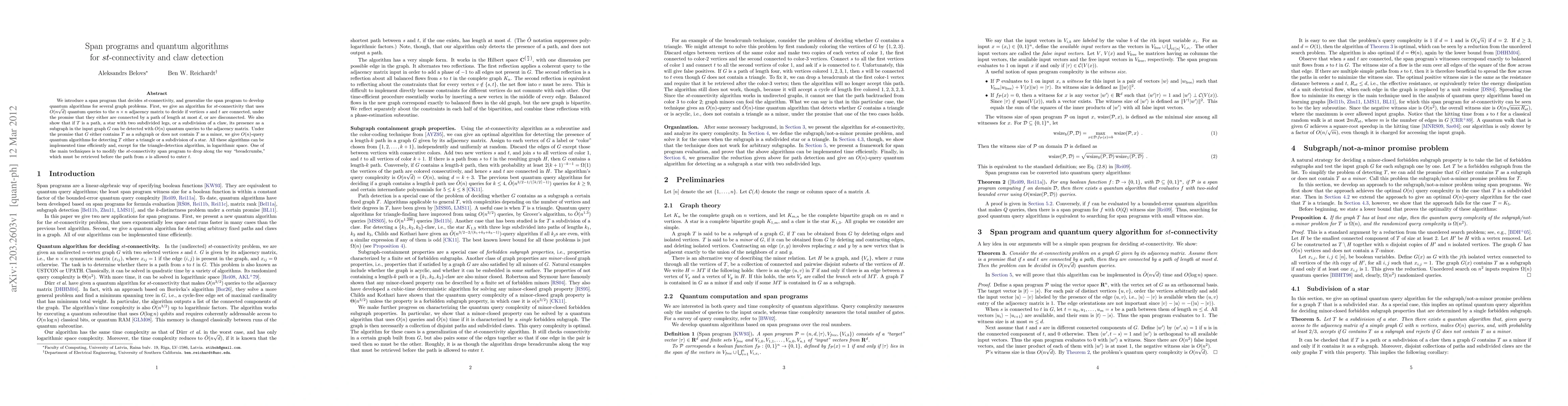 We introduce a span program that decides st-connectivity, and generalize the span program to develop quantum algorithms for several graph problems. First, we give an algorithm for st-connectivity that uses O(n d^{1/2}) quantum queries to the n x n adjacency matrix to decide if vertices s and t are connected, under the promise that they either are connected by a path of length at most d, or are disconnected. We also show that if T is a path, a star with two subdivided legs, or a subdivision of a claw, its presence as a subgraph in the input graph G can be detected with O(n) quantum queries to the adjacency matrix. Under the promise that G either contains T as a subgraph or does not contain T as a minor, we give O(n)-query quantum algorithms for detecting T either a triangle or a subdivision of a star. All these algorithms can be implemented time efficiently and, except for the triangle-detection algorithm, in logarithmic space. One of the main techniques is to modify the st-connectivity span program to drop along the way "breadcrumbs," which must be retrieved before the path from s is allowed to enter t.