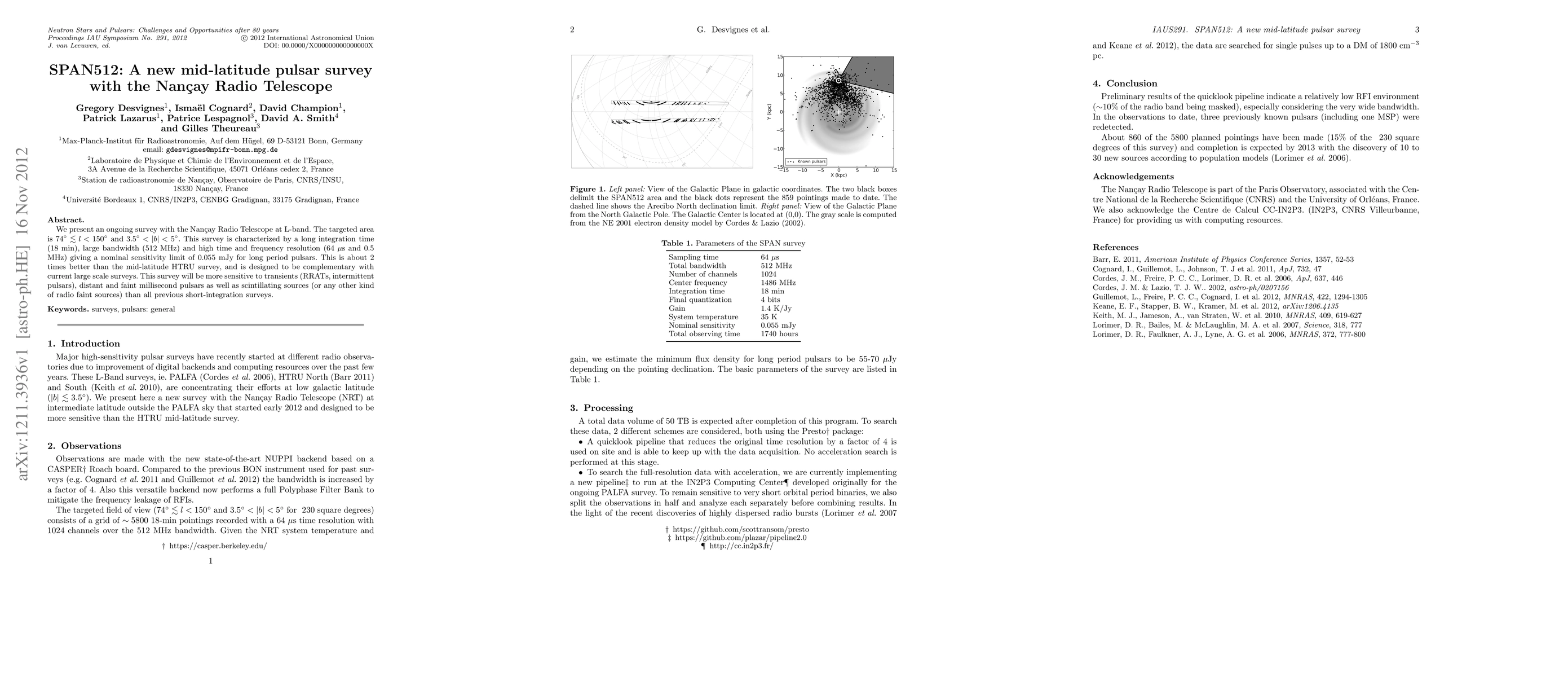 The research utilizes the Nancay Radio Telescope with a state-of-the-art NUPPI backend for an ongoing pulsar survey at L-band, targeting an area of 74° ≤ l < 150° and 3.5° < |b| < 5°. It employs a long integration time (18 min), large bandwidth (512 MHz), and high time and frequency resolution (64 µs and 0.5 MHz) to achieve a nominal sensitivity limit of 0.055 mJy for long period pulsars.