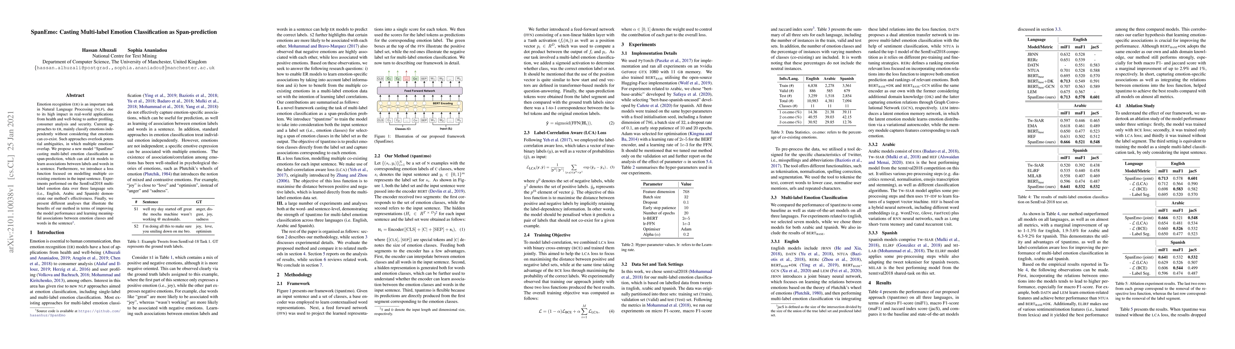 The paper proposes SpanEmo, a novel model for multi-label emotion classification by framing it as span-prediction, which captures co-existing emotions in text. Experiments on SemEval2018 data show improved performance and better associations between emotion labels and words.