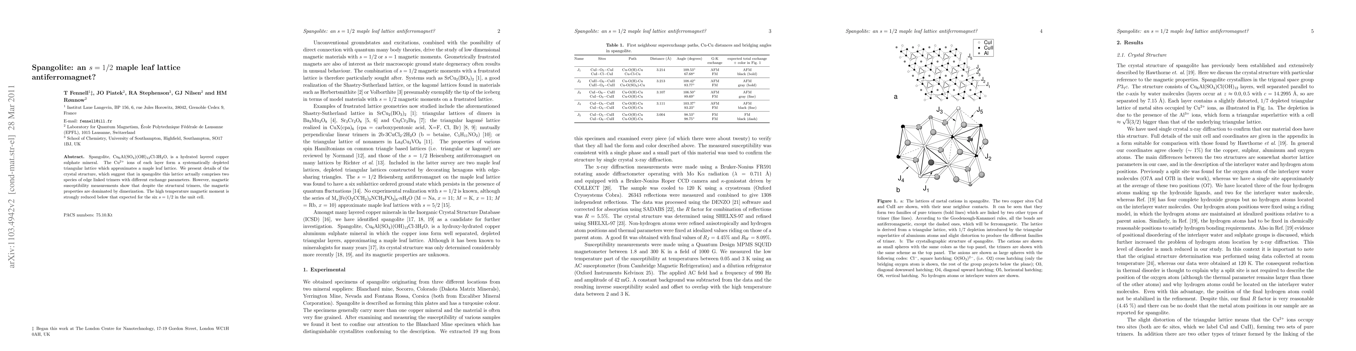Spangolite, Cu6Al(SO4)(OH)12Cl.3H2O, is a hydrated layered copper sulphate mineral. The Cu2+ ions of each layer form a systematically depleted triangular lattice which approximates a maple leaf lattice. We present details of the crystal structure, which suggest that in spangolite this lattice actually comprises two species of edge linked trimers with different exchange parameters. However, magnetic susceptibility measurements show that despite the structural trimers, the magnetic properties are dominated by dimerization. The high temperature magnetic moment is strongly reduced below that expected for the six s=1/2 in the unit cell.