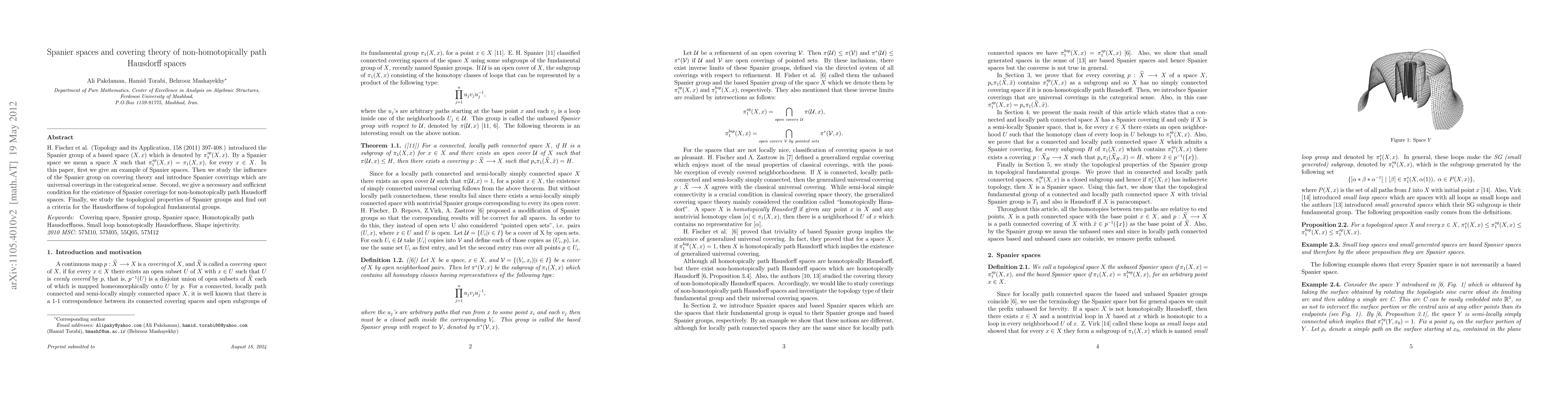 This paper introduces Spanier spaces where the Spanier group equals the fundamental group for all base points. It explores Spanier coverings in covering theory and provides conditions for their existence in non-homotopically path Hausdorff spaces, along with criteria for the Hausdorffness of topological fundamental groups.