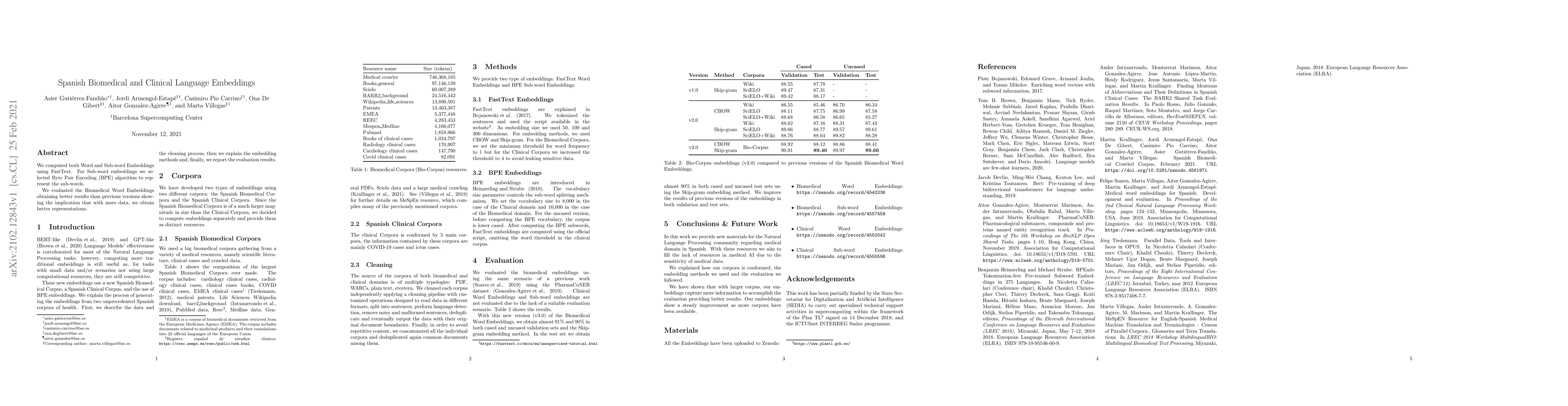 Summary: This paper uses FastText to generate Word and Sub-word embeddings for Spanish biomedical and clinical language, employing Byte Pair Encoding for Sub-word embeddings. The results indicate that increased data leads to improved representation quality.