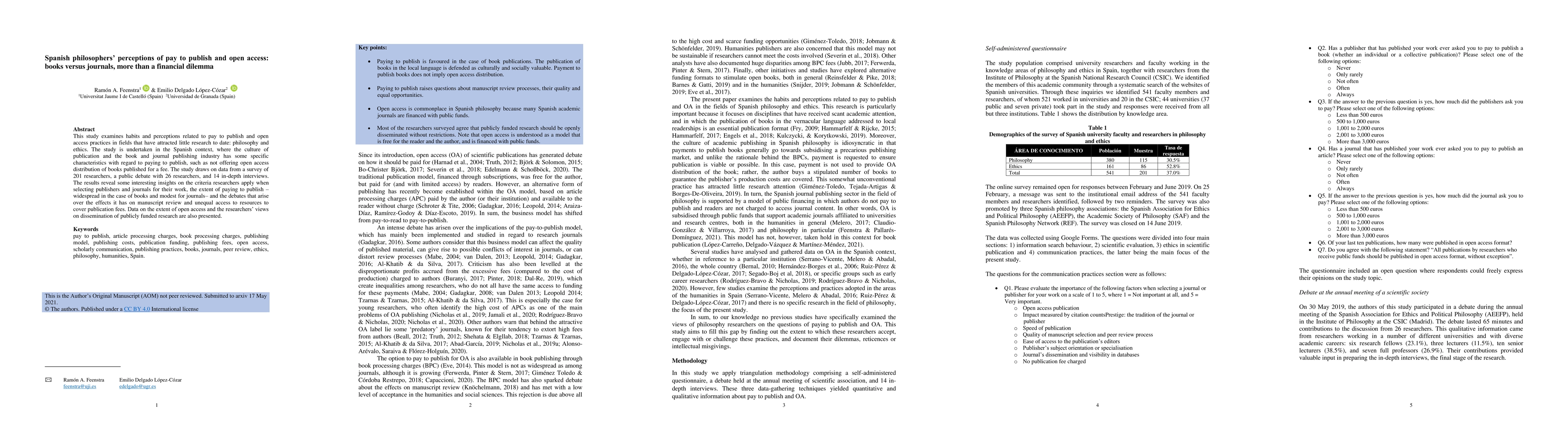 This study explores Spanish philosophers' perceptions of pay-to-publish and open access practices, revealing widespread book publication fees and modest journal fees, alongside debates on their impact on review processes and resource access. The research combines survey, debate, and interview data to highlight unique cultural factors influencing publication choices.