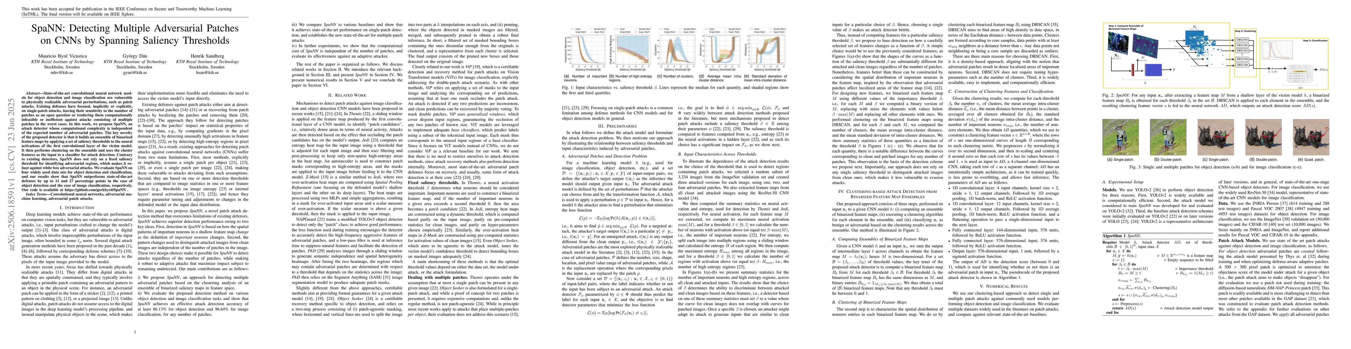 State-of-the-art convolutional neural network models for object detection and image classification are vulnerable to physically realizable adversarial perturbations, such as patch attacks. Existing defenses have focused, implicitly or explicitly, on single-patch attacks, leaving their sensitivity to the number of patches as an open question or rendering them computationally infeasible or inefficient against attacks consisting of multiple patches in the worst cases. In this work, we propose SpaNN, an attack detector whose computational complexity is independent of the expected number of adversarial patches. The key novelty of the proposed detector is that it builds an ensemble of binarized feature maps by applying a set of saliency thresholds to the neural activations of the first convolutional layer of the victim model. It then performs clustering on the ensemble and uses the cluster features as the input to a classifier for attack detection. Contrary to existing detectors, SpaNN does not rely on a fixed saliency threshold for identifying adversarial regions, which makes it robust against white box adversarial attacks. We evaluate SpaNN on four widely used data sets for object detection and classification, and our results show that SpaNN outperforms state-of-the-art defenses by up to 11 and 27 percentage points in the case of object detection and the case of image classification, respectively. Our code is available at https://github.com/gerkbyrd/SpaNN.