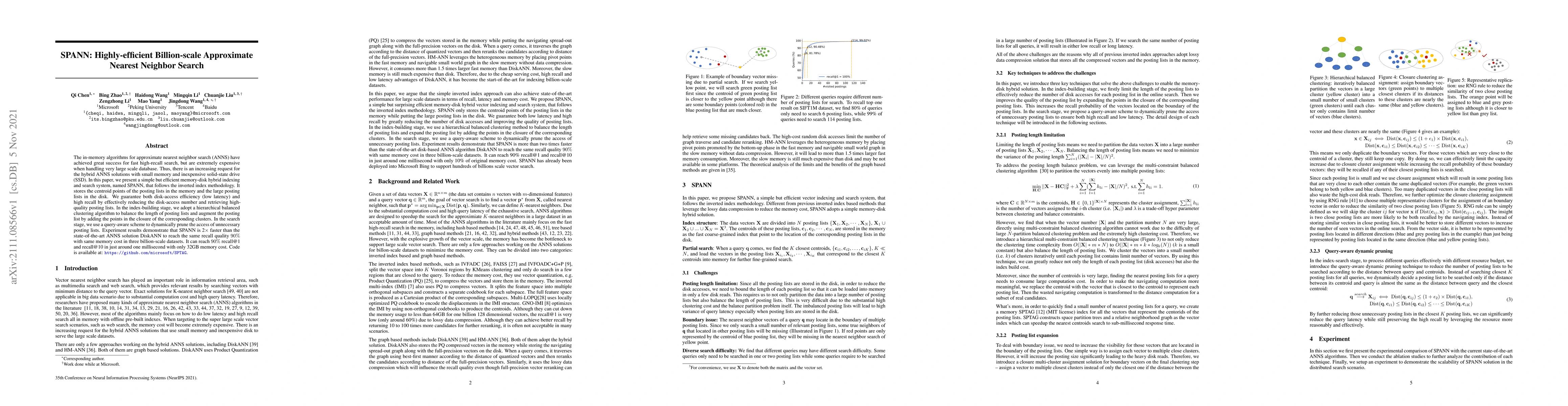 SPANN is a memory-disk hybrid indexing system for efficient billion-scale approximate nearest neighbor search, achieving high recall with reduced disk access and lower latency. It outperforms DiskANN by 2x in speed while maintaining 90% recall quality with 32GB memory.