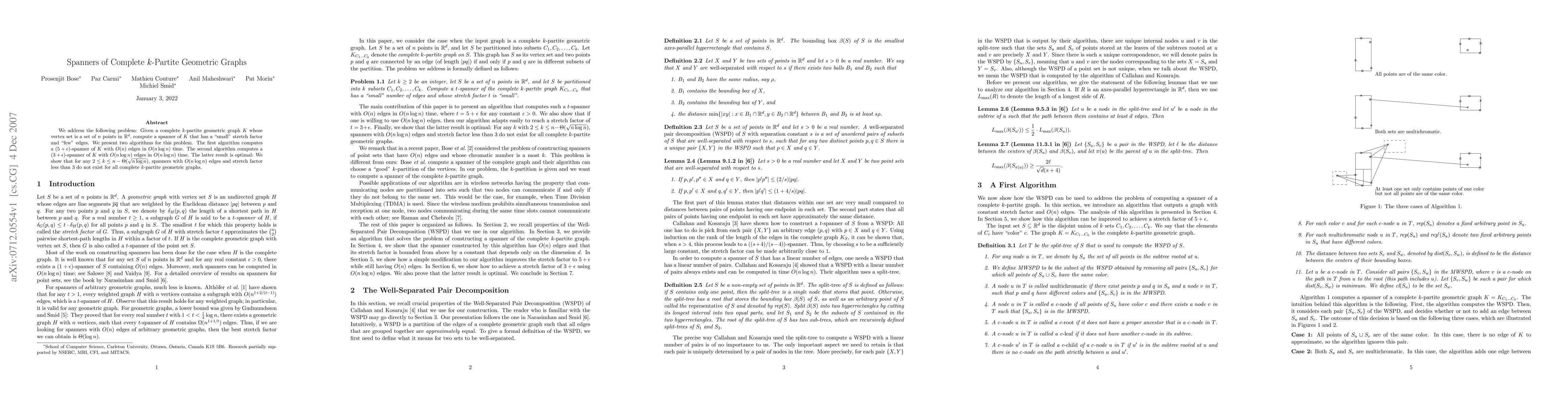 This paper presents algorithms to compute spanners for complete $k$-partite geometric graphs with minimal stretch and edge count. The first algorithm yields a $(5+\epsilon)$-spanner with $O(n)$ edges in $O(n \log n)$ time, while the second achieves a $(3+\epsilon)$-spanner with $O(n \log n)$ edges in the same time complexity, proving optimality for certain $k$ values.