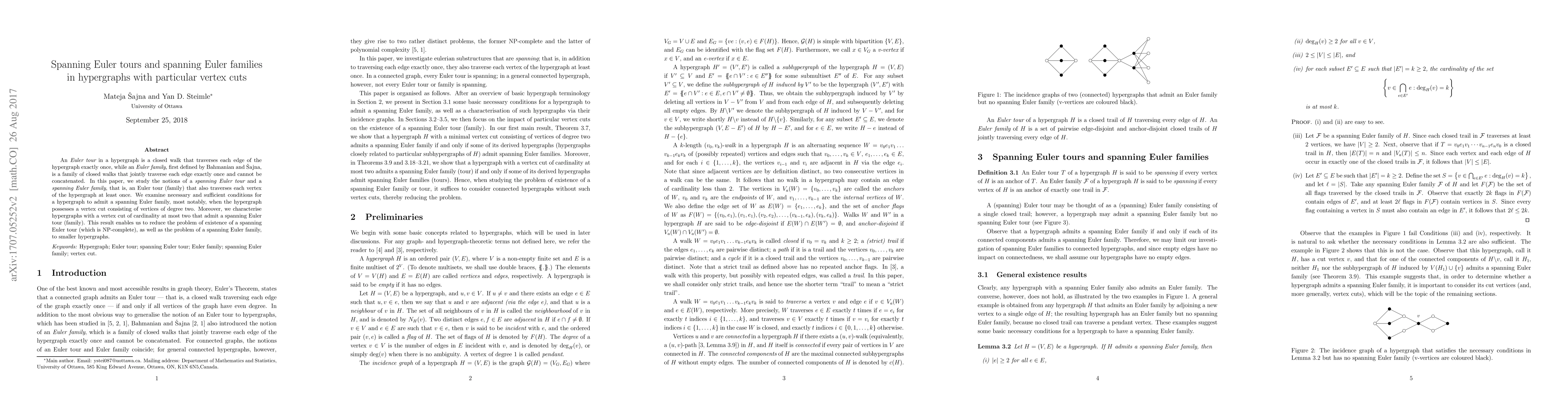 Researchers study spanning Euler tours and families in hypergraphs with vertex cuts, finding conditions for existence and reducing problems to smaller graphs.