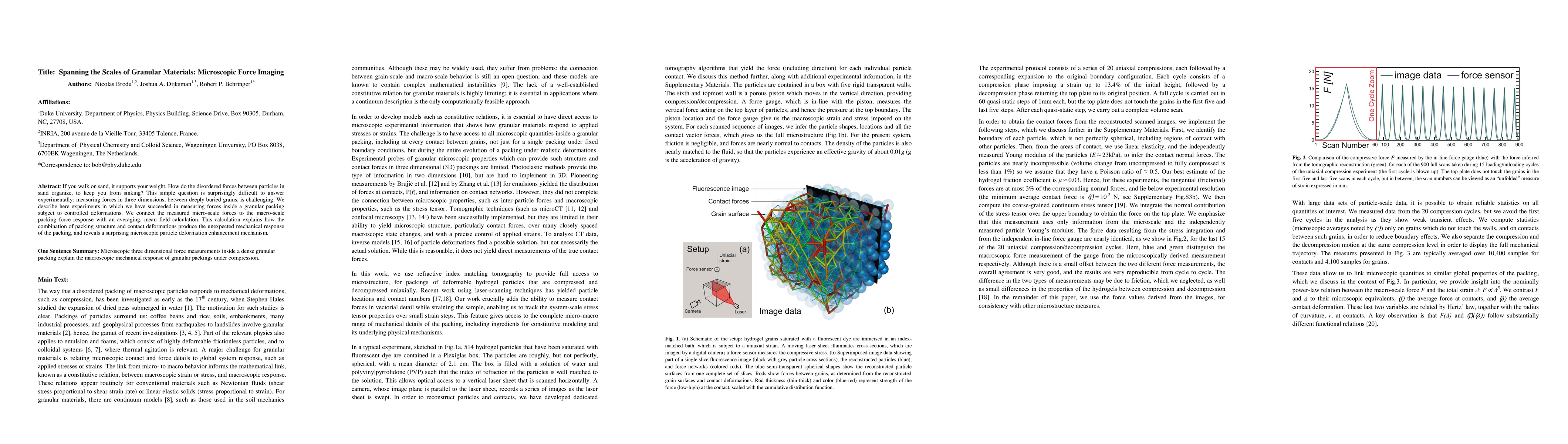 If you walk on sand, it supports your weight. How do the disordered forces between particles in sand organize, to keep you from sinking? This simple question is surprisingly difficult to answer experimentally: measuring forces in three dimensions, between deeply buried grains, is challenging. We describe here experiments in which we have succeeded in measuring forces inside a granular packing subject to controlled deformations. We connect the measured micro-scale forces to the macro-scale packing force response with an averaging, mean field calculation. This calculation explains how the combination of packing structure and contact deformations produce the unexpected mechanical response of the packing, and reveals a surprising microscopic particle deformation enhancement mechanism.