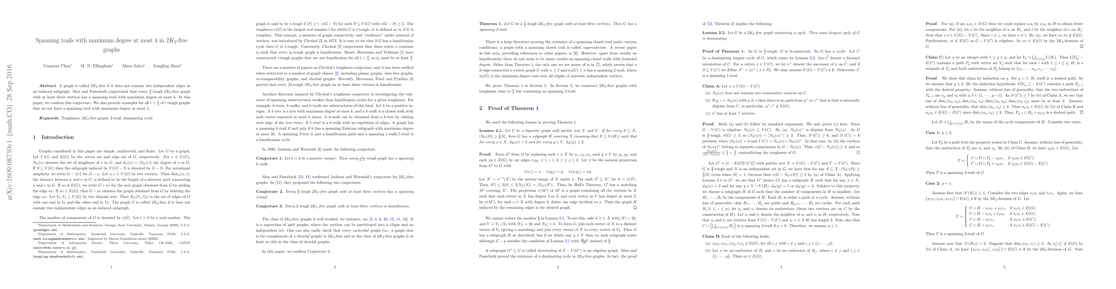 This paper confirms the conjecture that every $\frac{3}{2}$-tough $2K_2$-free graph with at least three vertices contains a spanning trail with maximum degree at most $4$. It also provides counterexamples for $t$-tough graphs with $t < \frac{5}{4}$ lacking such a spanning trail.